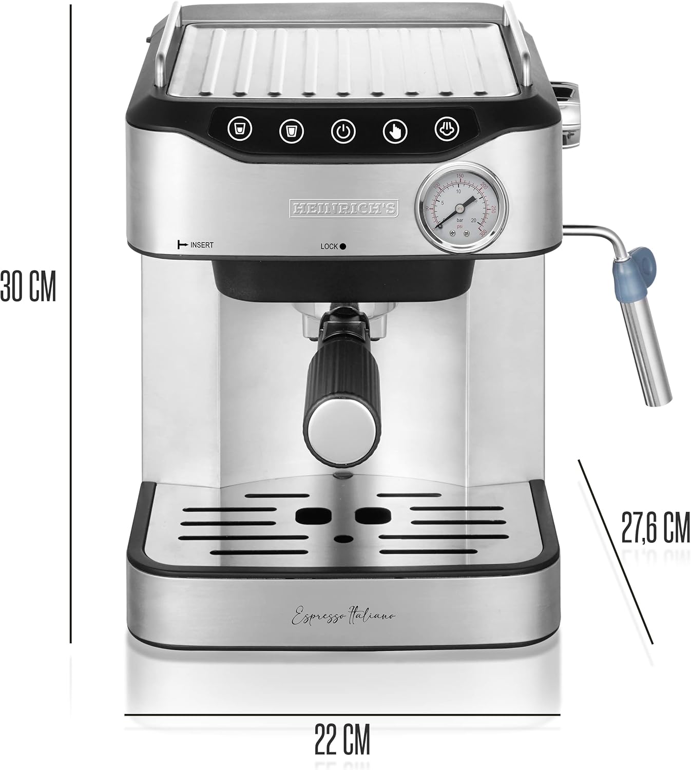 دستگاه اسپرسوساز HEINRICHS، دستگاه پورتافیلتر باریستا با ۸۵۰ وات، فشار ۲۰ بار، دستگاه قهوه ساز با کف ساز شیر، دهانه دوتایی، سینی چکه گیر قابل جدا شدن، مخزن آب ۱.۶ لیتری، صفحه نمایش لمسی LED