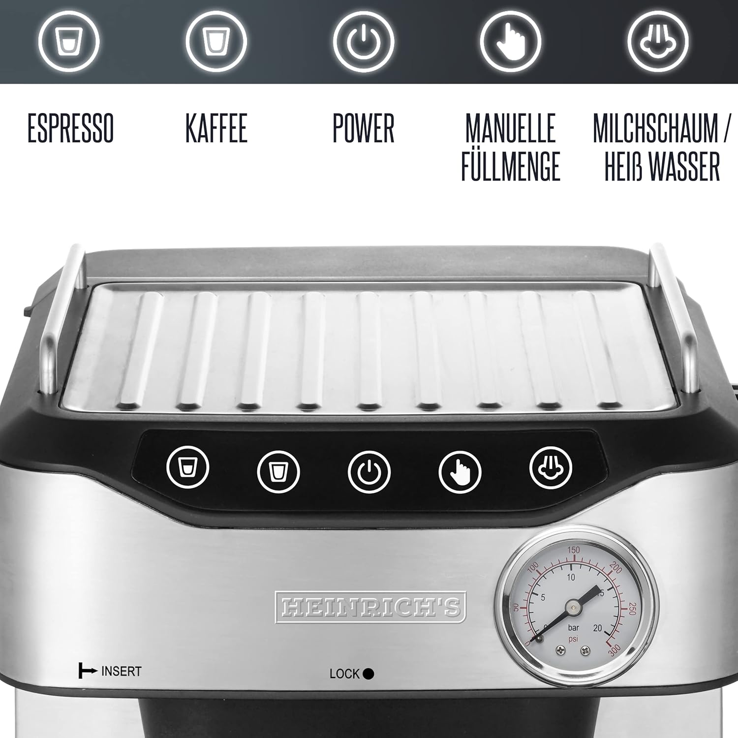 HEINRICHS Espressomaschine, Barista Siebträgermaschine mit 850W, 20 Bar Druck, Kaffeemaschine mit Milchaufschäumerstab, Doppelauslauf, abnehmbares Tropfgitter, 1.6Liter Wassertank, LED-Touch-Display | قیمت یورویی 89.99€