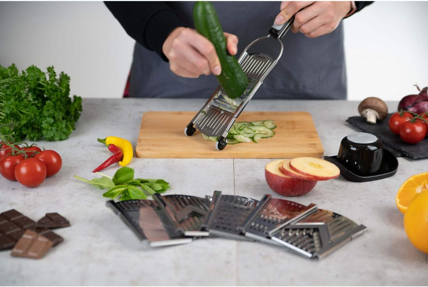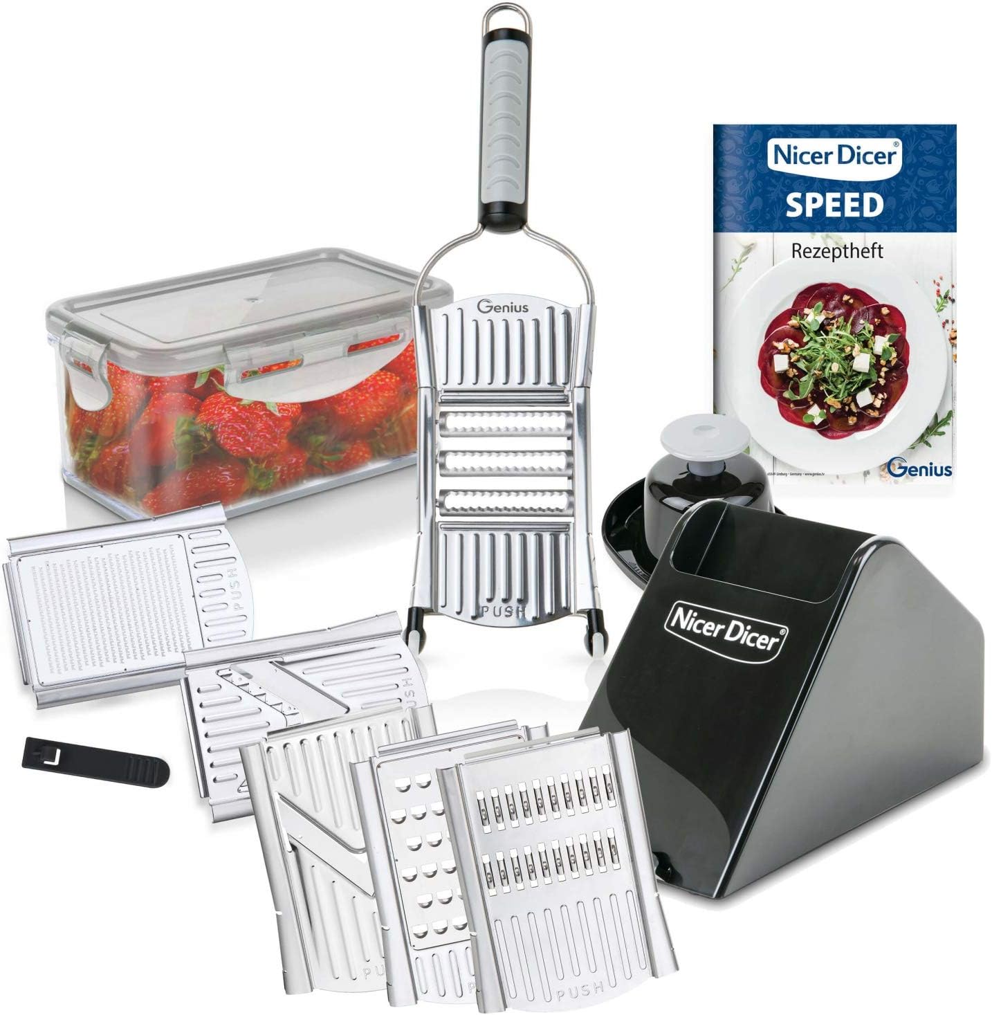 Genius Nicer Dicer Speed Deluxe-Set 13-teilig Handhobel V-Hobel - Verstellbarer Hobel manuell mit V-Klinge aus Edelstahl - Gemüseschneider Gemüsehobel mit Julienne-schneider, Silber | قیمت یورویی 59.95€