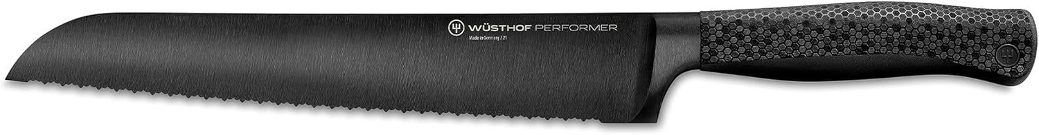 Geschmiedetes Messer mit ultraharter Diamond-like Carbon (DLC) Beschichtung. Ergonomischer Griff mit einzigartiger Hexagon-Power-Grip Struktur. Rasantes, tiefschwarzes Design. Fühle die Power und erlebe die ultimative Schärfe eines echten Profimessers Das scharfe Messer für Brot mit harten Krusten, Weißbrot mit weichem Kern oder große Früchte setzt Maßstäbe. Sobald man die Klinge ansetzt, greifen die großen Wellen souverän zu, während die kleinen für sanftes Gleiten sorgen – ein richtig gutes Brotmesser DLC-Technologie: die schwarze Beschichtung stammt aus Raumfahrt und Motorsport und erhöht die Oberflächenhärte des rostfreien Edelstahls um 146 %. Zusätzlich reduziert die DLC-Klinge den Reibungswiderstand – für müheloses Schneiden mit weniger Kraftaufwand Griff mit Hexagon-Power-Grip Design: Der rutschfeste Messergriff und das perfekt ausbalancierte Set-up mit Vollkropf (geschmiedete Verdickung zwischen Klingen und Griff) garantieren extreme Kontrolle bei jedem Schnitt mit diesem Wellenschliff-Messer Solinger Messer: Die WÜSTHOF Performer Serie vereint höchste Qualität, dynamische Balance und rasantes Design. Made in Germany – für alle, die keine Kompromisse machen, sondern hochwertige Kochmesser Profi Messer schätzen | قیمت یورویی : 225.99€
