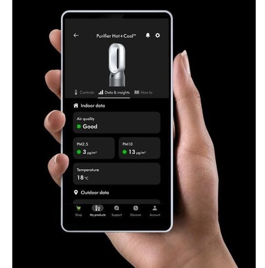 سازگار با خانه هوشمند و متصل به برنامه MyDyson.⁸ دستگاه تصفیه هوای Dyson Purifier Hot+Cool خود را با عملکرد گرمایش کنترل کنید و کیفیت هوا را از هر مکانی با برنامه MyDyson™ کنترل کنید.³