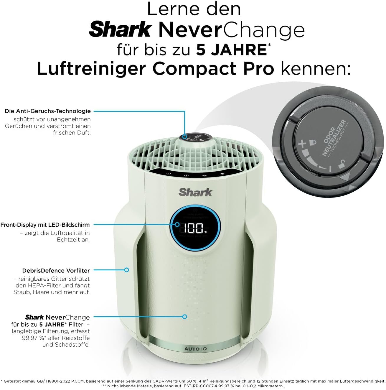 Shark NeverChange Luftreiniger für bis zu 5 Jahre, für Zuhause, Raumabdeckung 23 m2, kompakter Luftreiniger, HEPA-Filter, fängt 99,97% der Allergene, leise, LED-Display, Mint HP072EUGN für 23sqm Raumgröße Mint