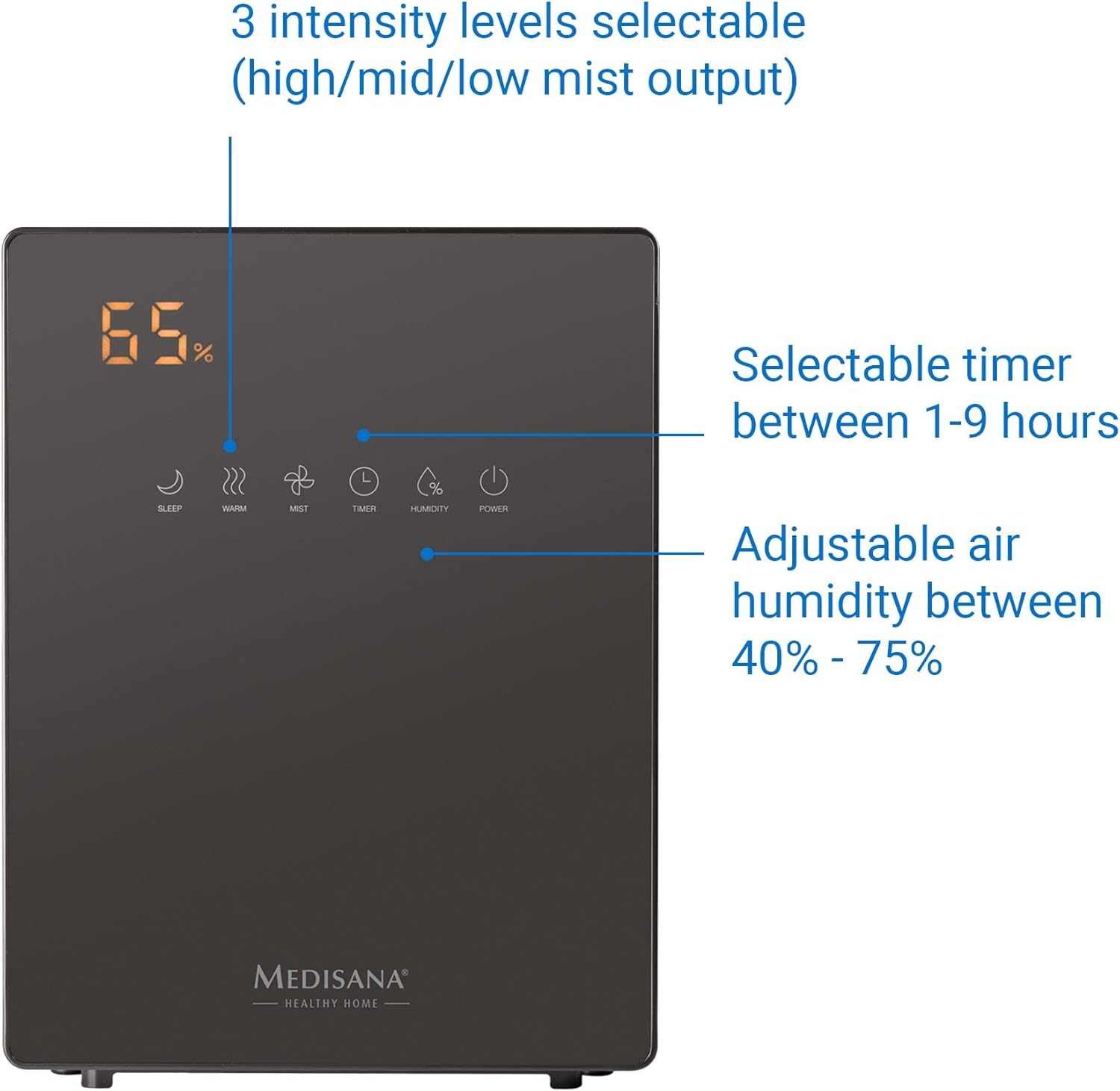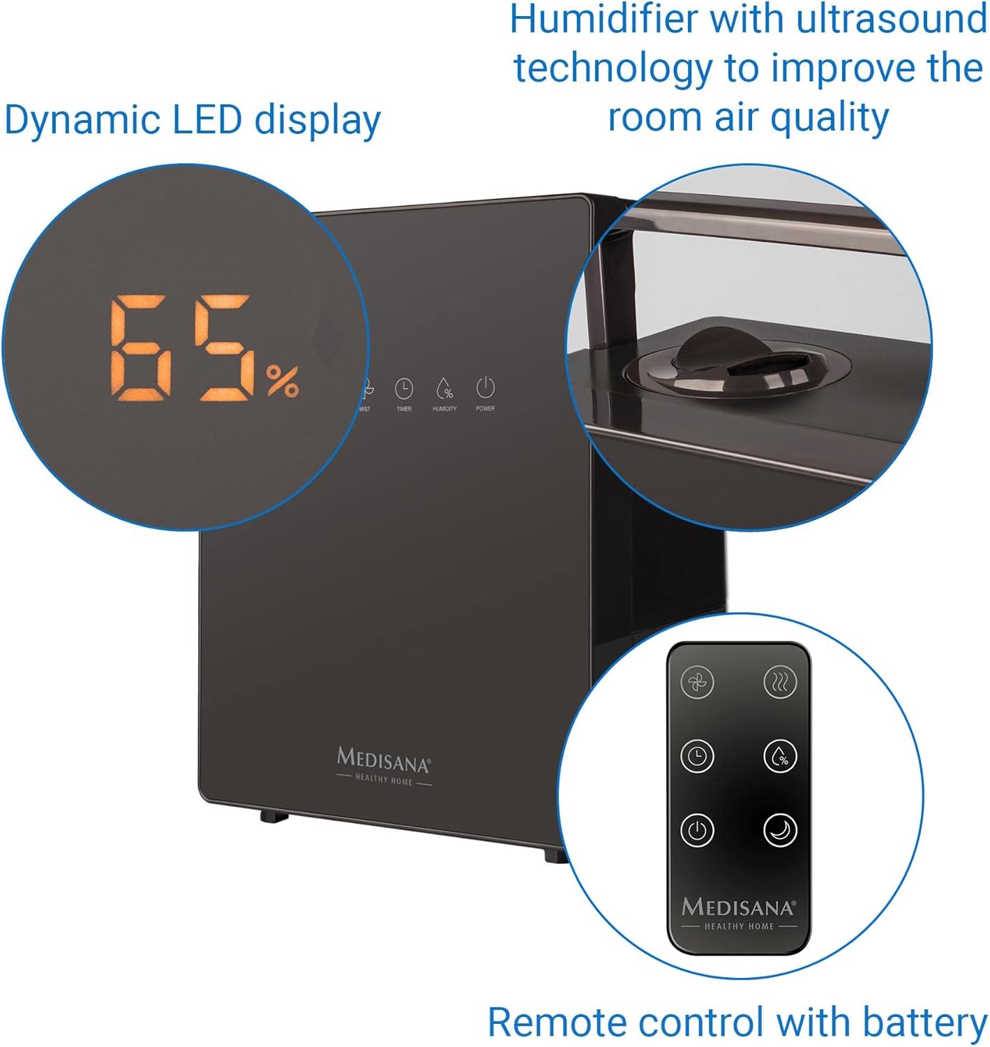 medisana AH 675 Luftbefeuchter mit Hygrometer, Timerfunktion, Vorheizfunktion, 3 Zerstäubungsintensitäten, Ideal für Kinderzimmer, Wohnzimmer und Schlafzimmer, 5,2 Liter Füllmenge 5,2 L Wassertank | قیمت یورویی 59€
