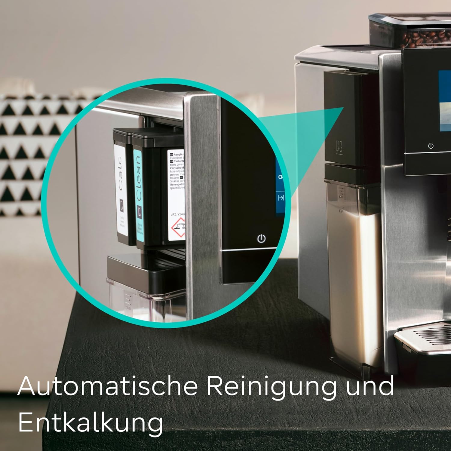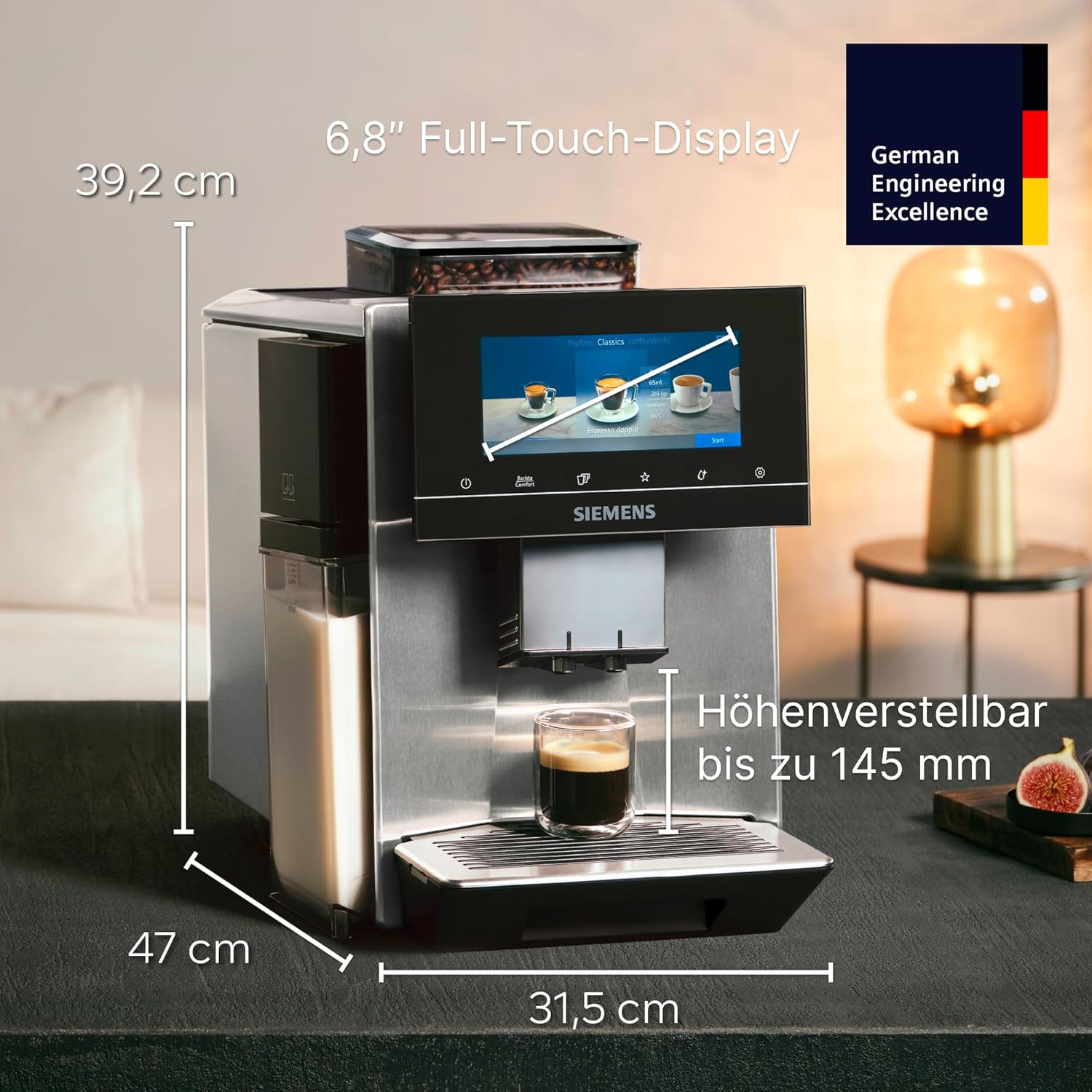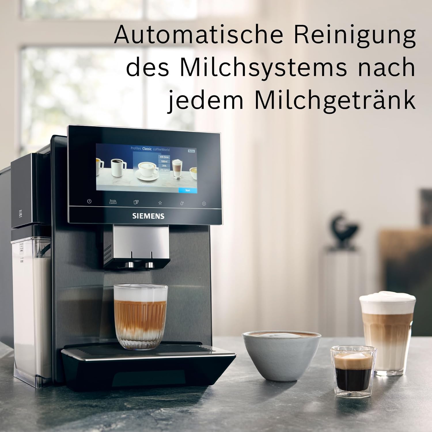 تمیز کردن و رسوب زدایی خودکار: تمیز کردن و رسوب زدایی به صورت خودکار انجام می‌شود، بنابراین دستگاه همیشه آماده استفاده است. تنظیمات شخصی: baristaMode به شما امکان می‌دهد تنظیماتی مانند قدرت، مقدار، آسیاب، زمان تماس و دمای دم کردن را تنظیم کنید، در حالی که comfortMode عملکرد سریع و آسانی را ارائه می‌دهد. عطر هماهنگ: سیستم beanIdent تنظیمات را با نوع دانه انتخاب شده تطبیق می‌دهد، eGrinder همچنین امکان تنظیم جداگانه درجه آسیاب برای هر نوشیدنی را فراهم می‌کند. کنترل از طریق اپلیکیشن: عملکرد از هر نقطه از طریق اپلیکیشن Home Connect با دسترسی به حداکثر ۳۶ غذای ویژه بین‌المللی، قابلیت پخش لیست پخش و یابنده beanType موارد دلخواه: اپلیکیشن Home Connect، آسیاب الکترونیکی، سیستم beanIdent، حالت باریستا، حالت راحتی، تمیز کردن خودکار شیر، فوق‌العاده بی‌صدا، نمایشگر iSelect 6.8 اینچی، تمیز کردن خودکار، گرم نگه داشتن صفحه