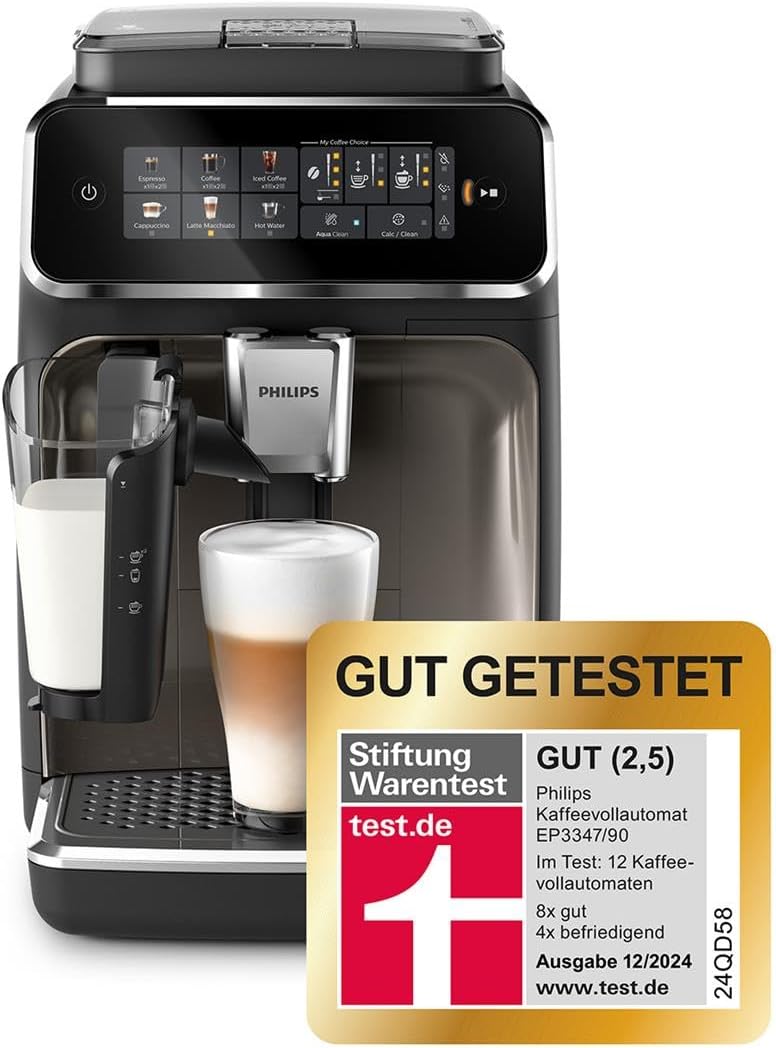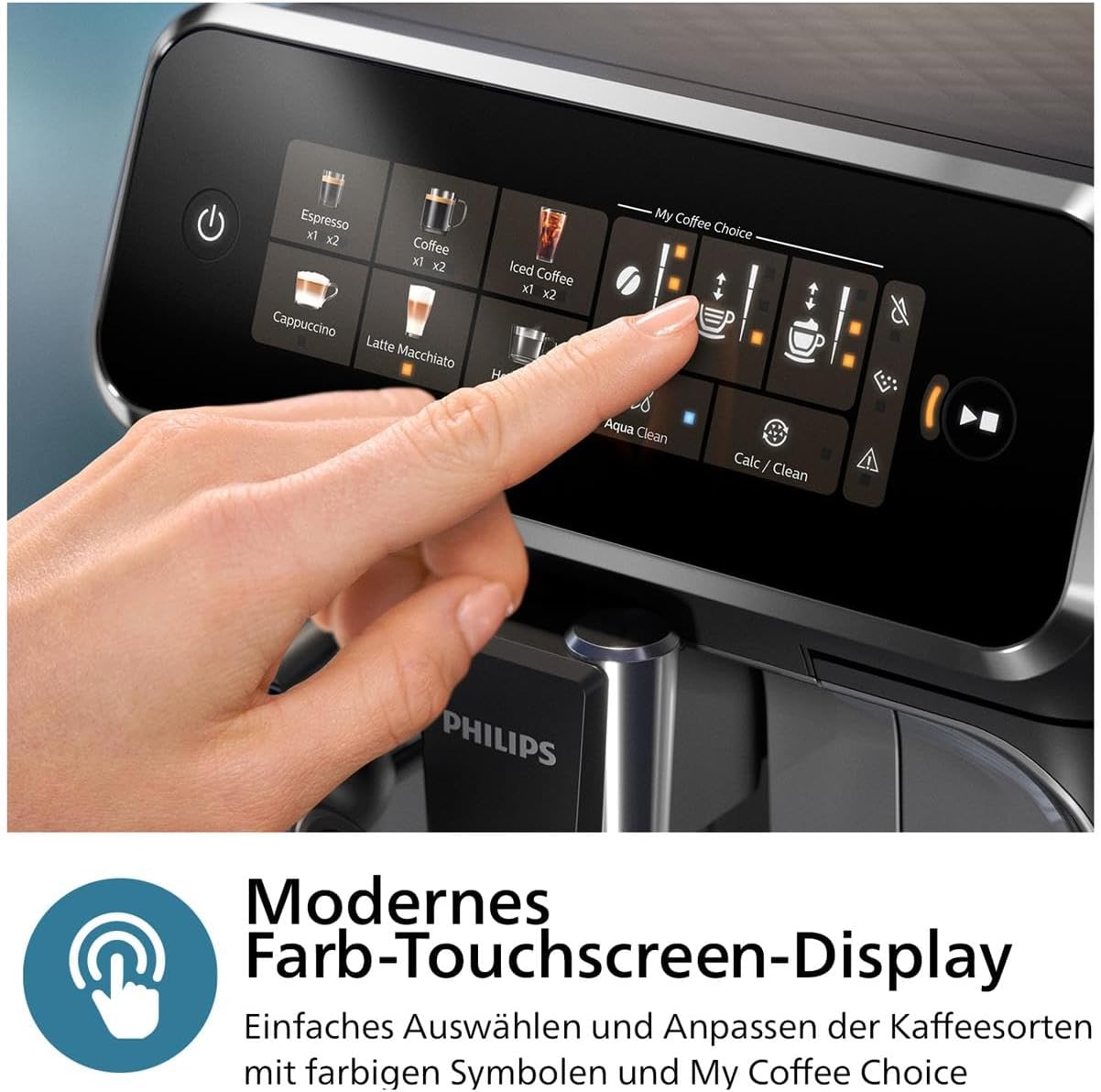 PHILIPS 3300 Series Kaffeevollautomat - 6 Getränke, Modernes Farb-Touchscreen-Display, LatteGo-Milchsystem, SilentBrew, 100% Keramikmahlwerk, AquaClean Filter. Schwarzchrom (EP3347/90) | قیمت یورویی 479€
