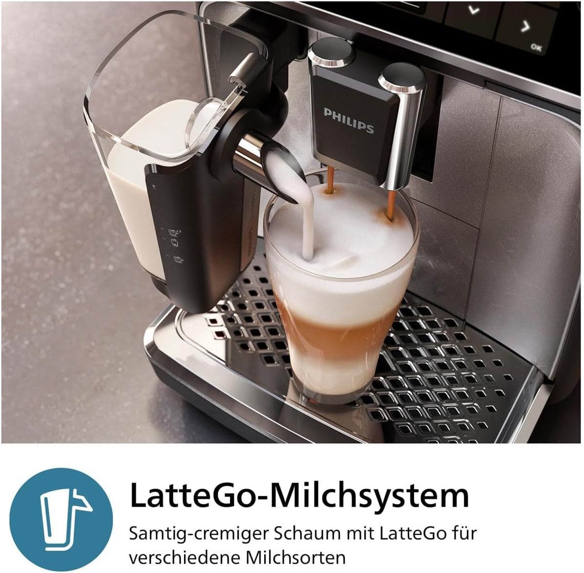 Samtig-cremiger Milchschaum: Die LatteGo bereitet automatisch samtig-cremigen Milchschaum für Ihren Milchkaffee mit verschiedenen Milchsorten zu. LatteGo ist das am schnellsten zu reinigende Milchsystem aller Zeiten: 2 Teile, keine Schläuche Einfache Kaffeeauswahl: Dank des modernen Touchscreen-Displays mit farbigen Symbolen können Sie Ihre Lieblingsgetränke ganz einfach auswählen Einfache Anpassung: Mit der My Coffee Choice-Funktion können Sie Ihren Kaffee ganz nach Ihrem Geschmack zubereiten: Wählen Sie Ihre bevorzugte Kaffeestärke, Größe und Milchschaummenge SilentBrew: Leise Zubereitung von aromatischem Kaffee mit unserer branchenführenden SilentBrew-Technologie Aquaclean Filter: Wenn Sie den Filter nach Aufforderung durch die Maschine wechseln, brauchen Sie Ihre Maschine bis zu 5000 Tassen*** lang nicht zu entkalken und können Ihren Kaffee mit klarem und gereinigtem Wasser genießen. Langlebiges Keramikmahlwerk: Bringen Sie den vollen Geschmack Ihres Kaffees mit unserem strapazierfähigen Keramikmahlwerk zur Geltung. Das langlebige Keramikmahlwerk kann in 12 Stufen von fein bis grob eingestellt werden. | قیمت یورویی : 479€