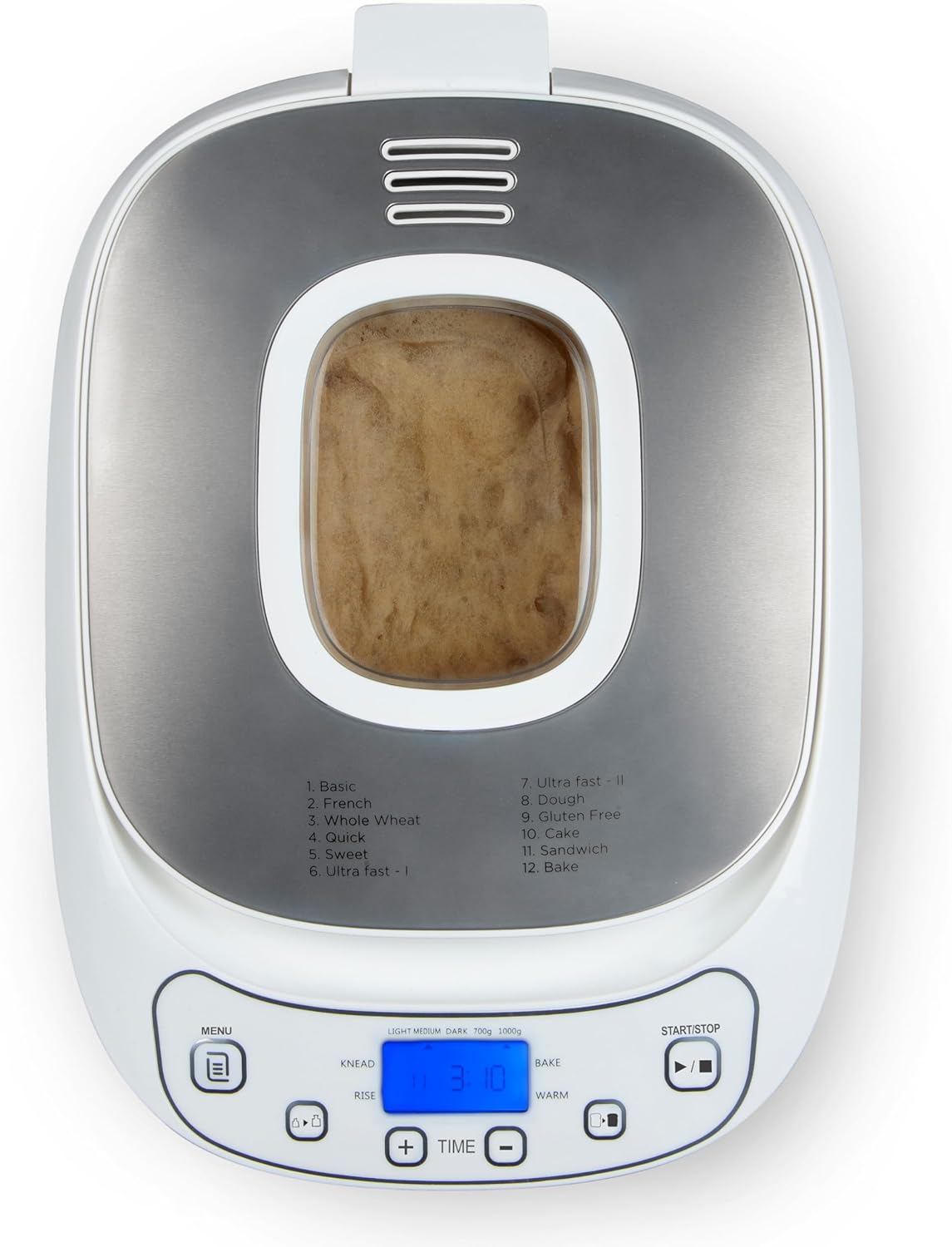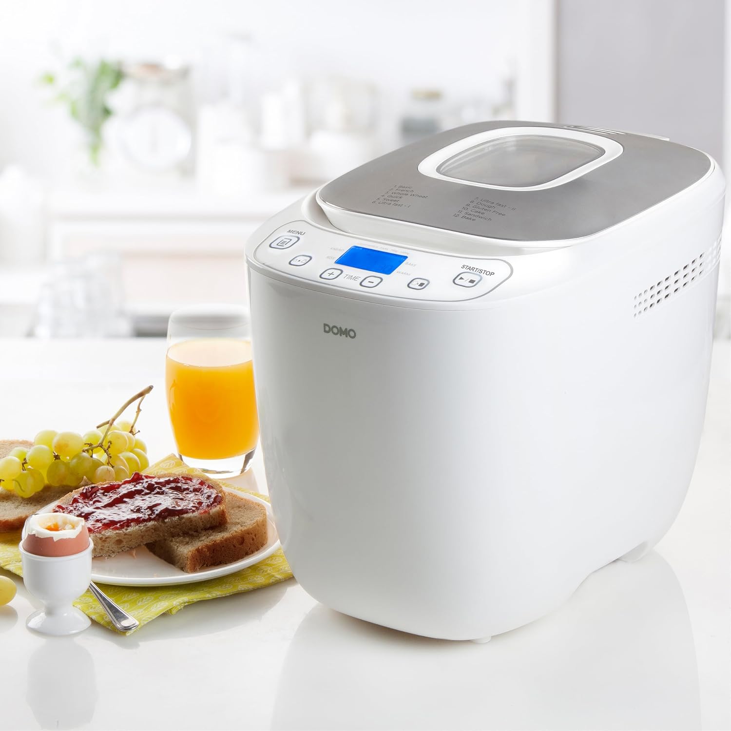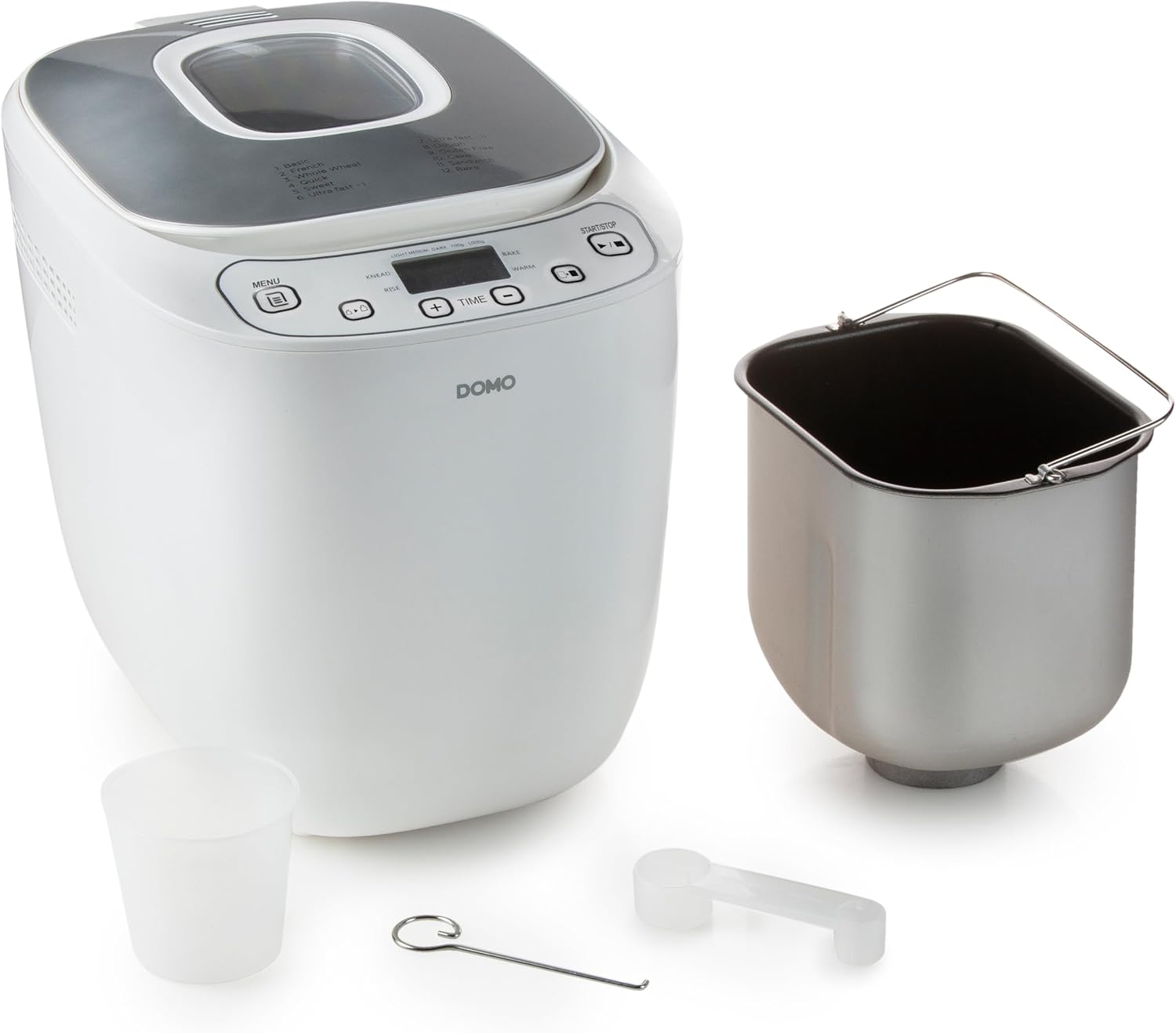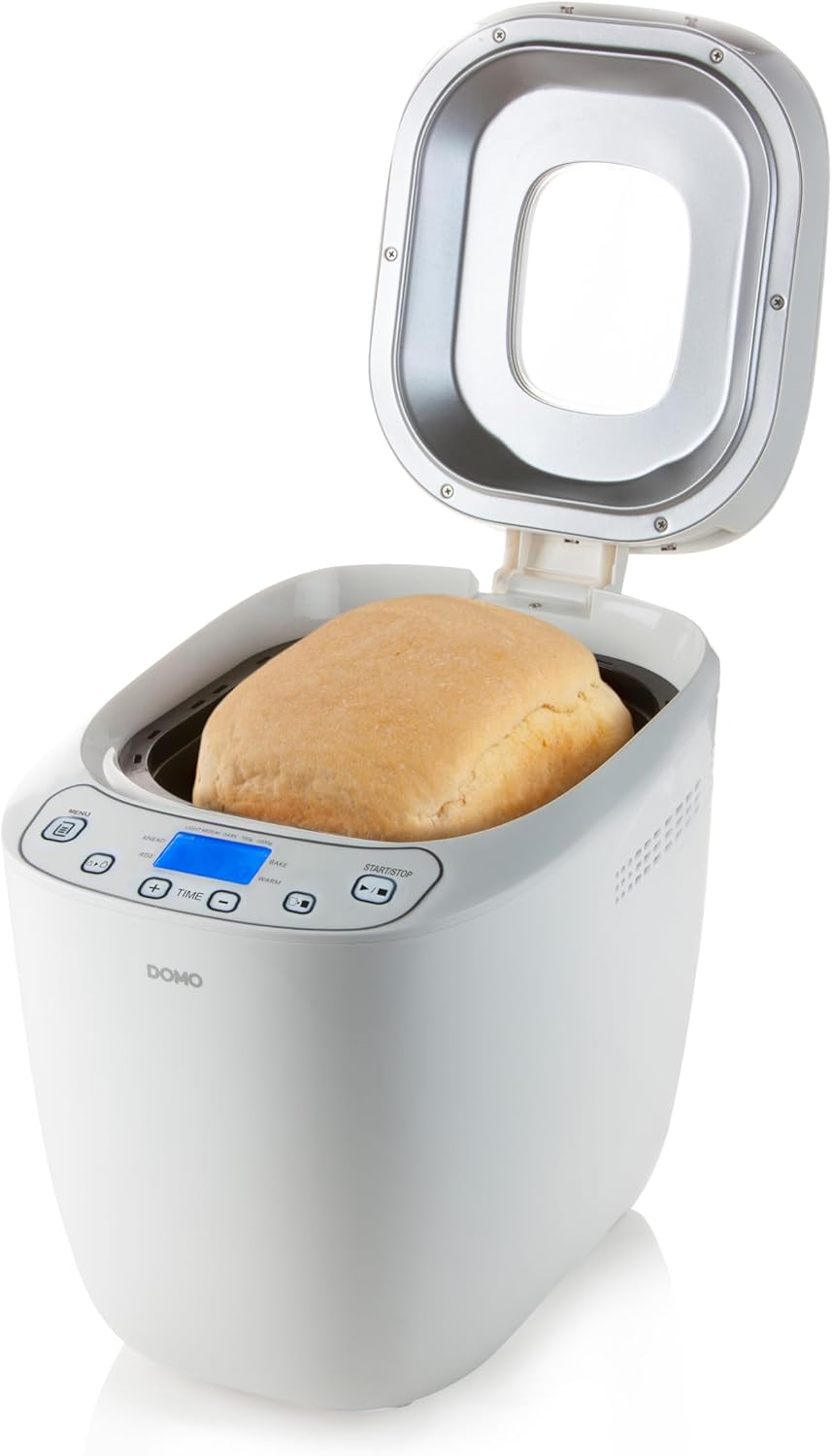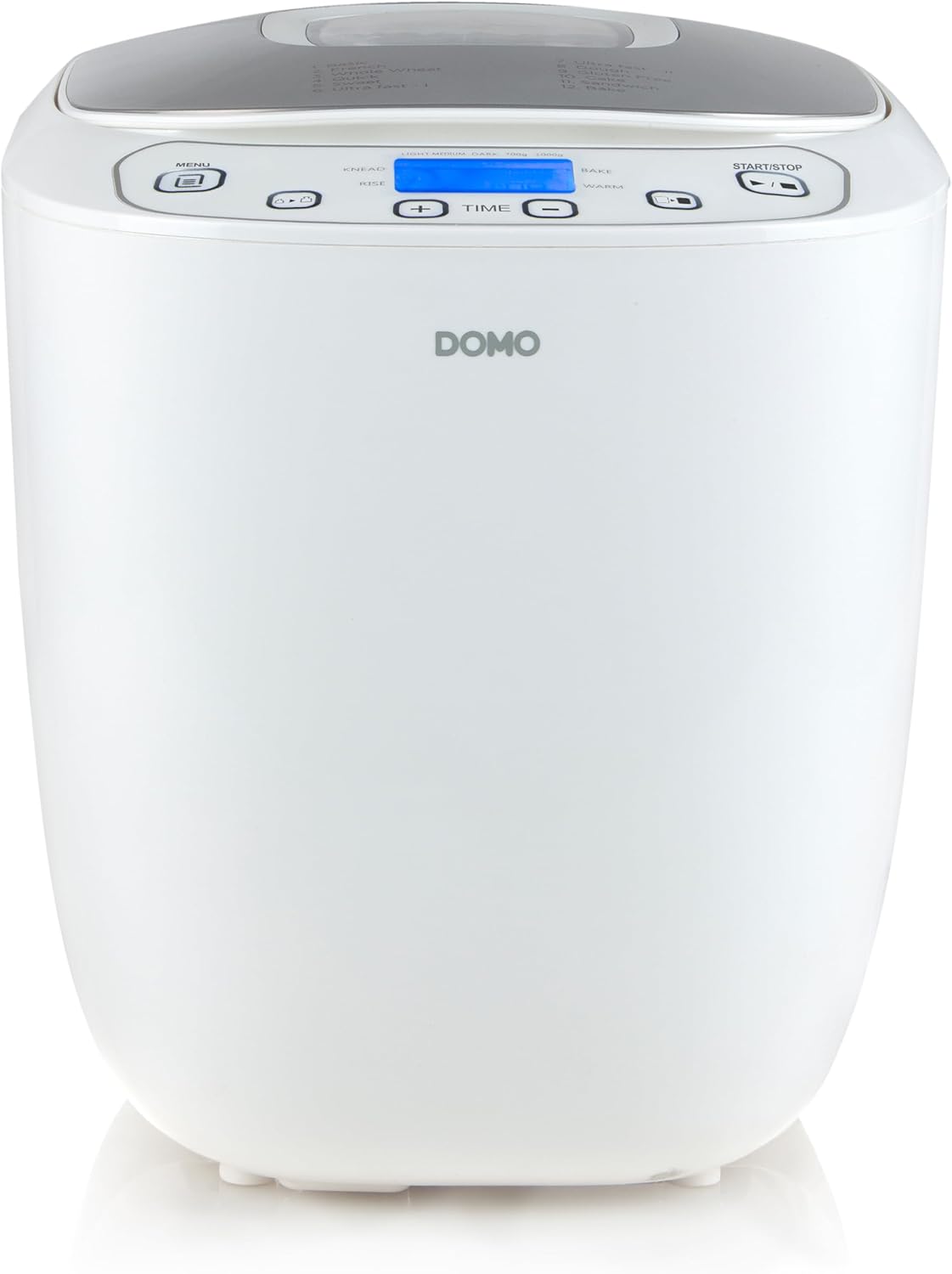 DOMO B3963 Brotbackautomat 700-1000g weiss + لینک آمازون : https://www.amazon.de/dp/B07XRQM79V?th=1&psc=1 برای نانهای ۷۰۰ یا ۱۰۰۰ گرمی، ۱۲ برنامه پخت مختلف، صفحه نمایش LCD، تایمر ۱۳ ساعته، عملکرد گرم نگه داشتن: ۶۰ دقیقه، کنترل پخت بین روشن، متوسط، تیره، ماهیتابه با روکش نچسب، دفترچه دستور پخت شامل برنامه پخت بدون گلوتن، ۲۳۰ ولت - ۵۰ هرتز - ۵۵۰ وات