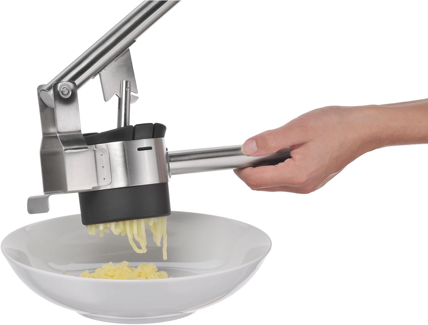 Inhalt: 1x Kartoffelpresse (Größe 35 x 13,6 x 9,7 cm, Lochgröße 3,2 mm) - Artikelnummer: 1872186030 Material: Cromargan Edelstahl 18/10 poliert - rostfrei, spülmaschinengeeignet, formstabil, hygienisch, säurefest und unverwüstlich. Einsatz aus Kunststoff Formstabile Presse zur mühelosen Herstellung von Kartoffelpüree, Gnocchi-Kartoffelteig oder Spätzle. Für Spätzle benötigen Sie einen dünneren Teig um ein optimales Spätzle Ergebnis zu erzielen Die Funktionsteile sind fest im Griff einzementiert. Mit praktischer Öse zur Aufbewahrung an einer Hängeleiste mit Haken Multifunktional einsetzbar: durch die größere Löchung kann die Presse auch für gekochtes Wurzelgemüse, Zucchini, Auberginen oder auch Früchte verwendet werden | قیمت یورویی : 40.06€