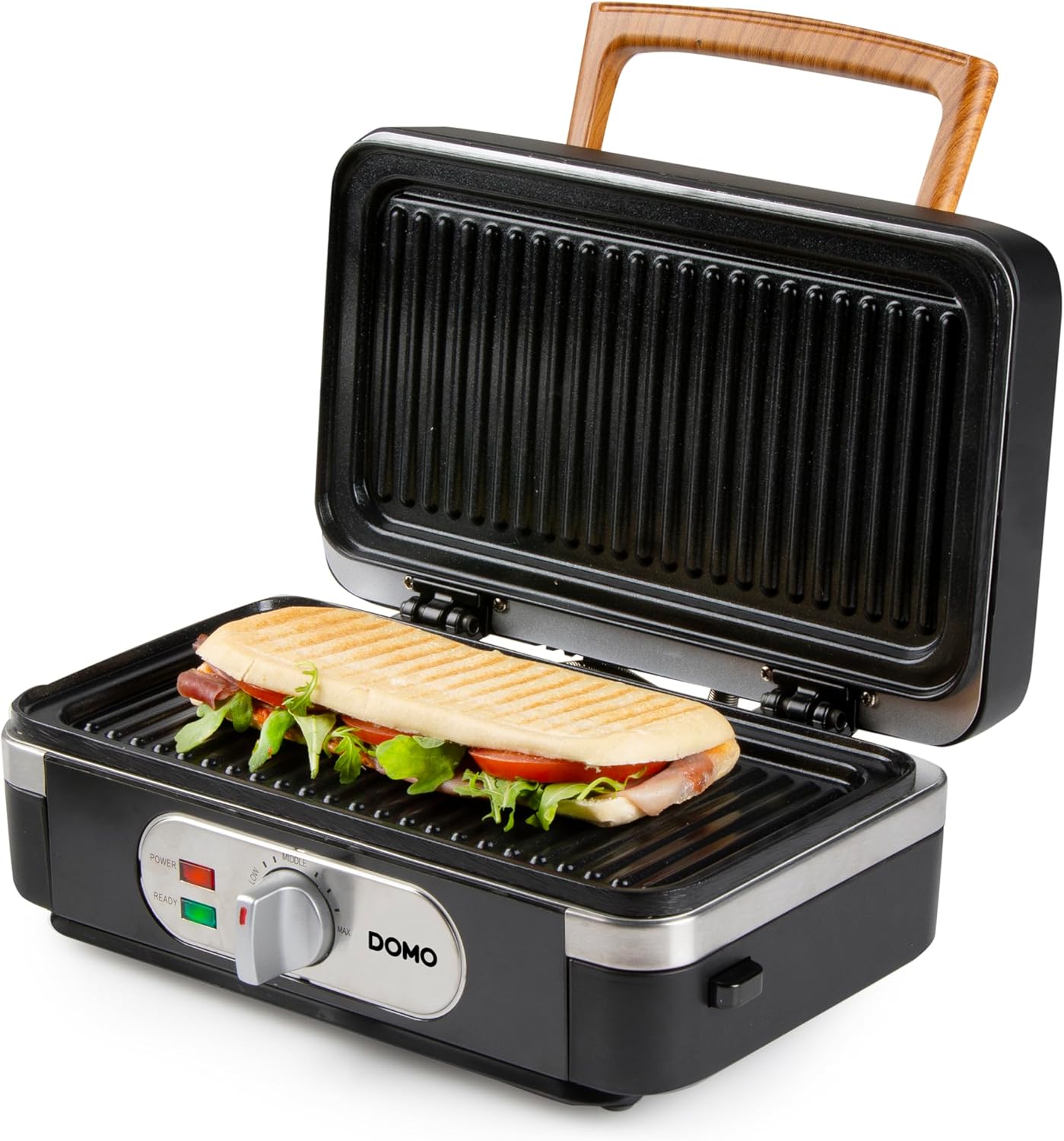 DOMO DO9278C Multifunktionsgerät 3-in-1 - Sandwichmaker - Waffeleisen - Kontaktgrill - 1100W - Mattes Design in Schwarz mit Holzgriff Black | قیمت یورویی 79.99€