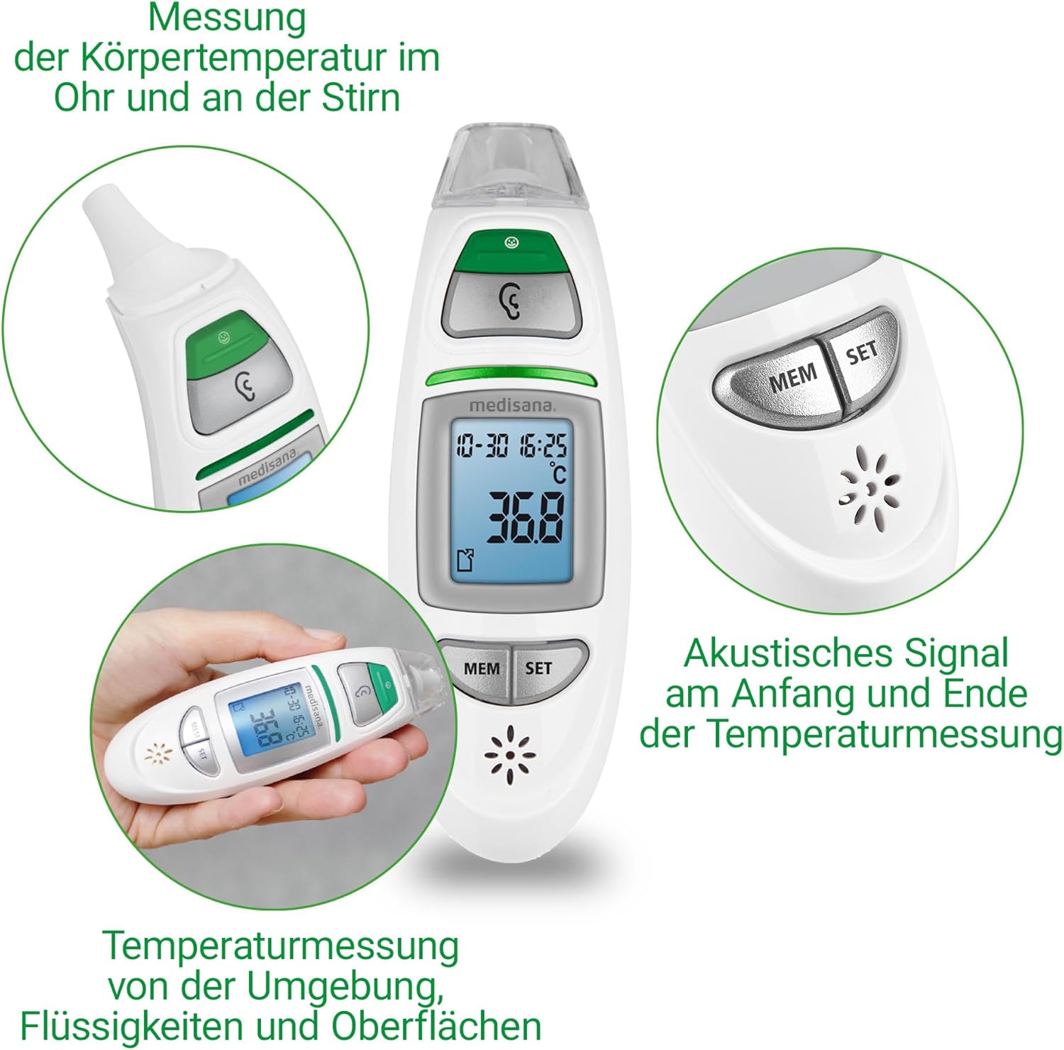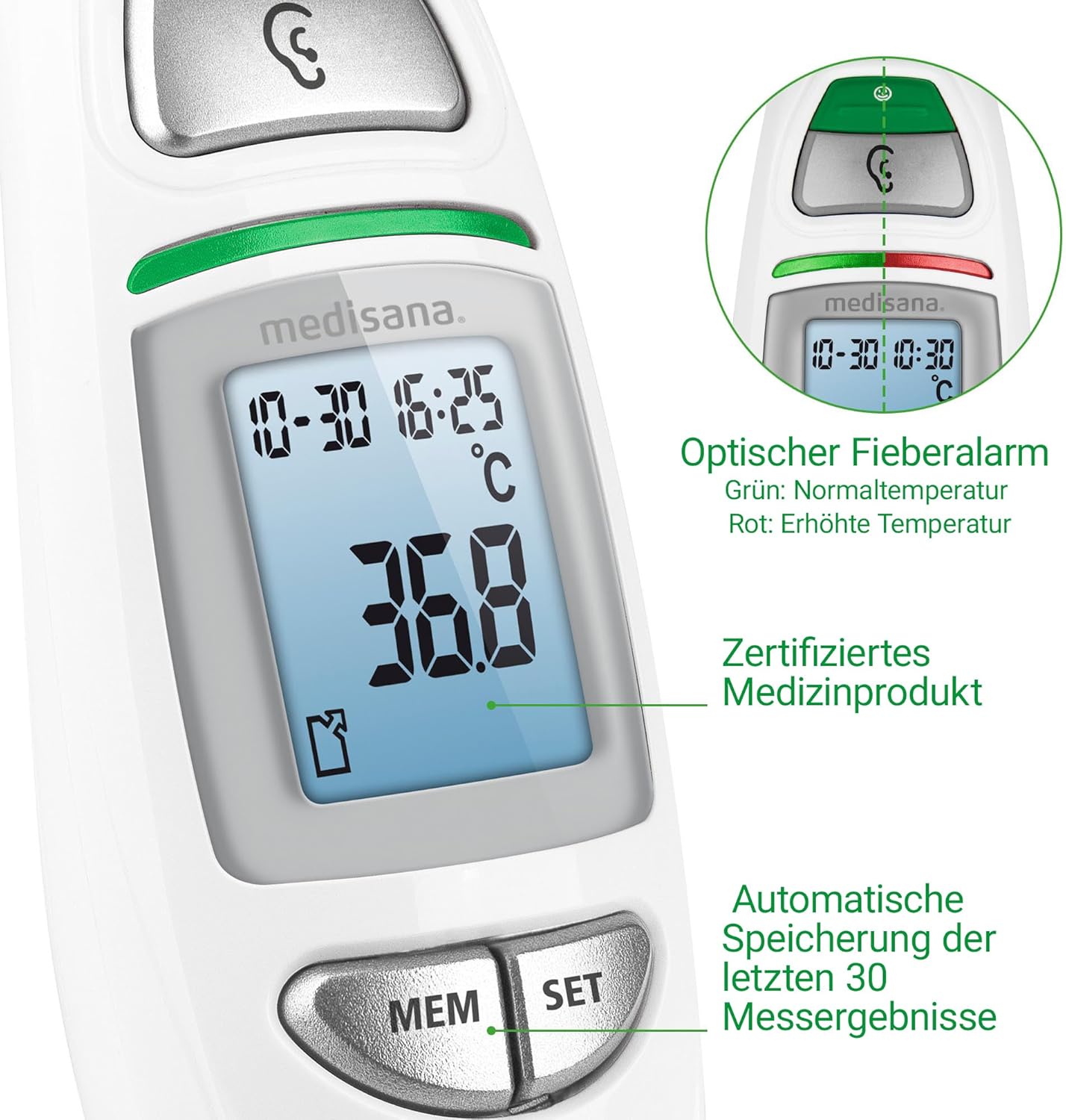 medisana TM 750 Fieberthermometer 6in1, Stirnthermometer für Baby, Kind und Erwachsene, Ohrthermometer mit visuellem Fieberalarm, Thermometer digital mit Speicherfunktion, Messung von Flüssigkeiten weiß | قیمت یورویی 25.18€