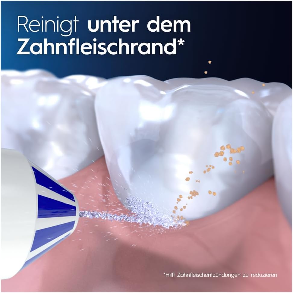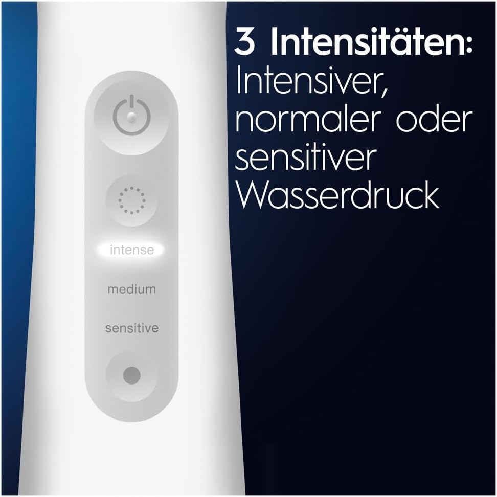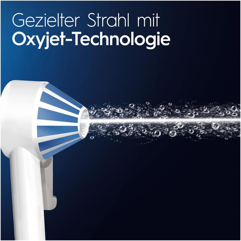 Sanfter Wasserstrahl für eine angenehme, aber effektive Reinigung von Zähnen & Zahnfleisch, ideal für Menschen mit empfindlichen Zähnen Einfache Reinigung des Wassertanks: Zuerst die blaue Verriegelung auf der Unterseite zurückziehen, um den Wassertank zu entfernen Oxyjet-Technologie: Mit Mikroluftblasen angereichertes Wasser Aktivieren Sie den Wasserstrahl bei Bedarf für eine präzise Reinigung 3 anpassbare Wasserintensitäten für eine intensive, mittlere oder sensitive Reinigung Wählen Sie zwischen dem gezielten Strahl, dem rotierenden Strahl oder dem Mehrfachstrahl Für eine einfache & flexible Awendung ohne Kabel Ideal bei Zahnspangen: Sanfte Entfernung von Speiseresten und Bakterien | قیمت یورویی : 82.99€