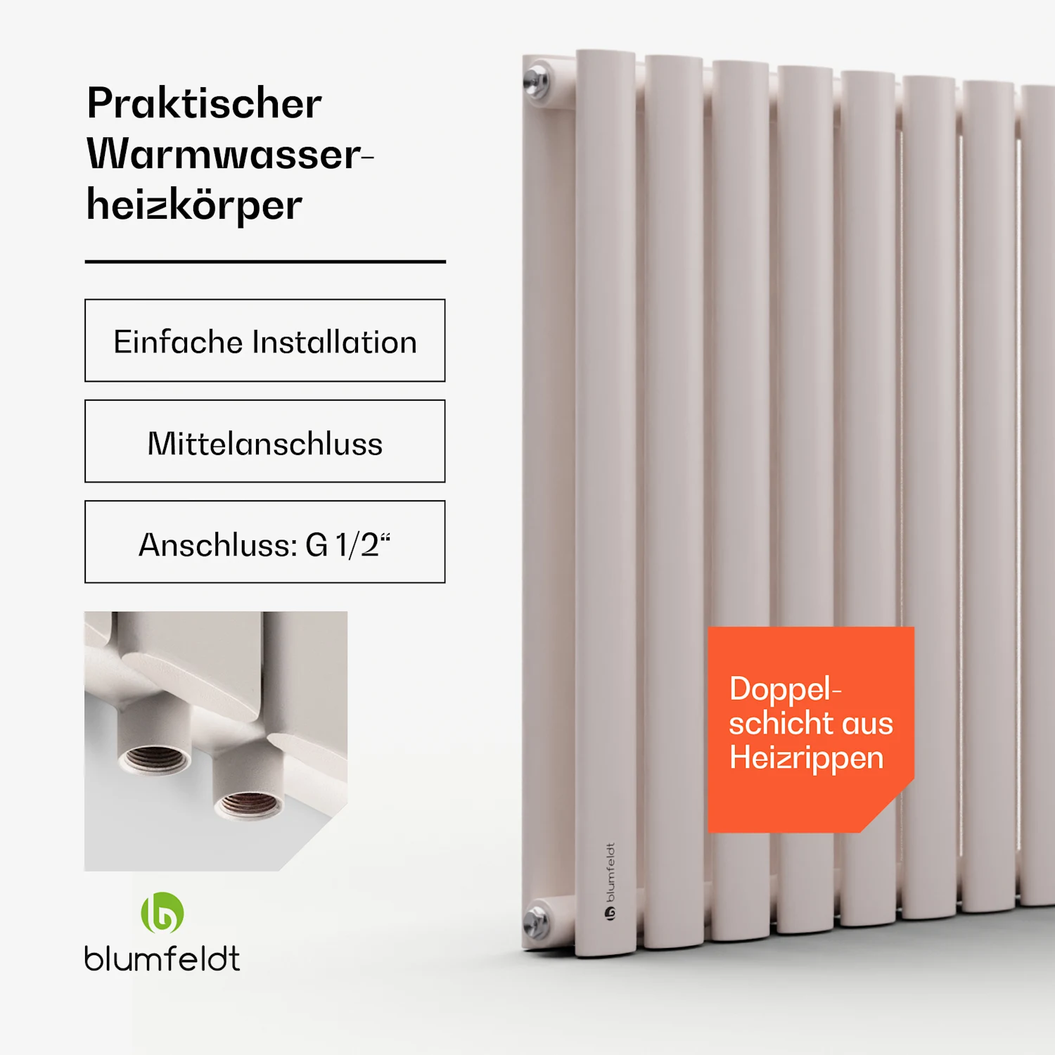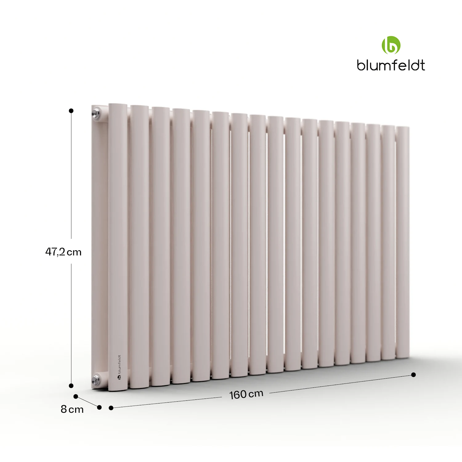 به لطف طراحی ویژه آن با عرض 100 سانتیمتر و عمق 8 سانتیمتر، کاملاً در هر اتاقی جا میشود. و به لطف شکافهای بین 17 لوله، تمیز کردن رادیاتور بسیار آسان است. گرمای دلپذیر بلافاصله پس از دوش گرفتن یا حمام کردن با رادیاتور Blumfeldt Tallheo 100 x 60 cm - یک تجربه شیک.