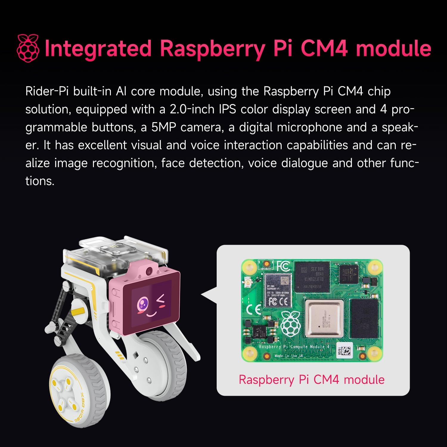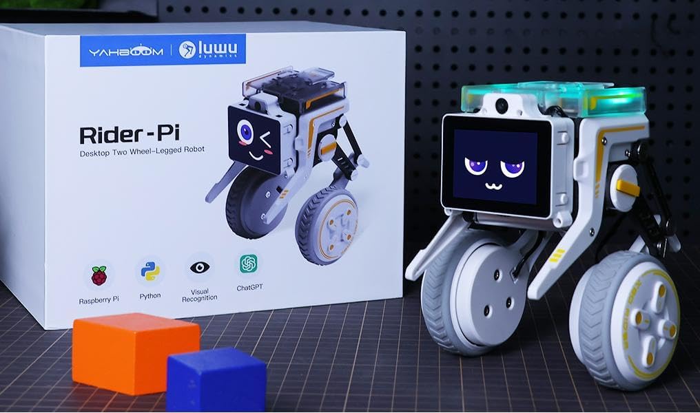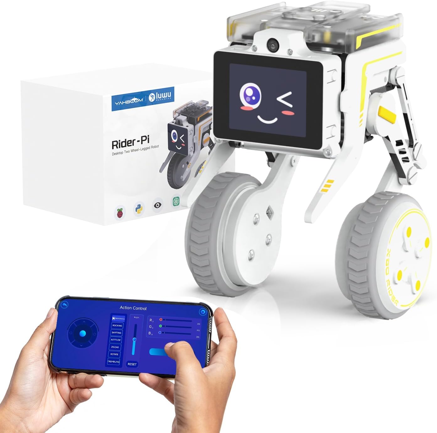 【Desktop-level Two Wheel-legged Robot】 It has the advantages of both wheels and legs, with wheeled mobility and legged obstacle-crossing capabilities. Rider-Pi adopts a connecting rod structure, equipped with dual-wheeled and legged motion joints and integrated hub motors, which can maintain stability on complex terrains such as slopes and steps, and provide agile and omnidirectional motion performance. 【Integrated Raspberry Pi CM4 module】 Rider-Pi has a built-in AI module and adopts the Raspberry Pi CM4 chip solution. It is equipped with a 2.0-inch IPS color display screen and 4 programmable buttons, a 5-megapixel camera, a digital microphone and a speaker. It has excellent visual and voice interaction capabilities and can realize image recognition, face detection, voice dialogue and other functions. 【Multi-controller collaboration】 Rider-Pi adopts a multi-controller collaborative architecture. The Raspberry Pi CM4 module is used as the host computer, responsible for computing tasks such as image and voice. ESP32 is used as the slave computer, responsible for the robot's power management, servo and motor driving, and core motion control algorithms. Through the multi-controller collaboration mode, Rider-Pi achieves more efficient task processing and resource utilization. 【Fun Gameplay】 Two mobile phone APP controls, WiFi version (with image transmission) and Bluetooth version, both support IOS and Android; 2.0-inch IPS display with 35 cute expressions, which change with the robot's state; the robot is equipped with an inertial measurement unit (IMU) to adjust the robot's posture in real time to adapt to various terrain obstacles. 【Chat-GPT Voice Interaction】Rider-Pi is equipped with a 5-megapixel camera, dual MEMS digital microphones and speakers. Using Chat-GPT, it provides rich image and voice interaction functions, and can realize image recognition, voice recognition and natural language processing, bringing users a more intelligent interactive experience. Please note: You need to purchase an account to use Chat-GPT. | قیمت یورویی : 479€