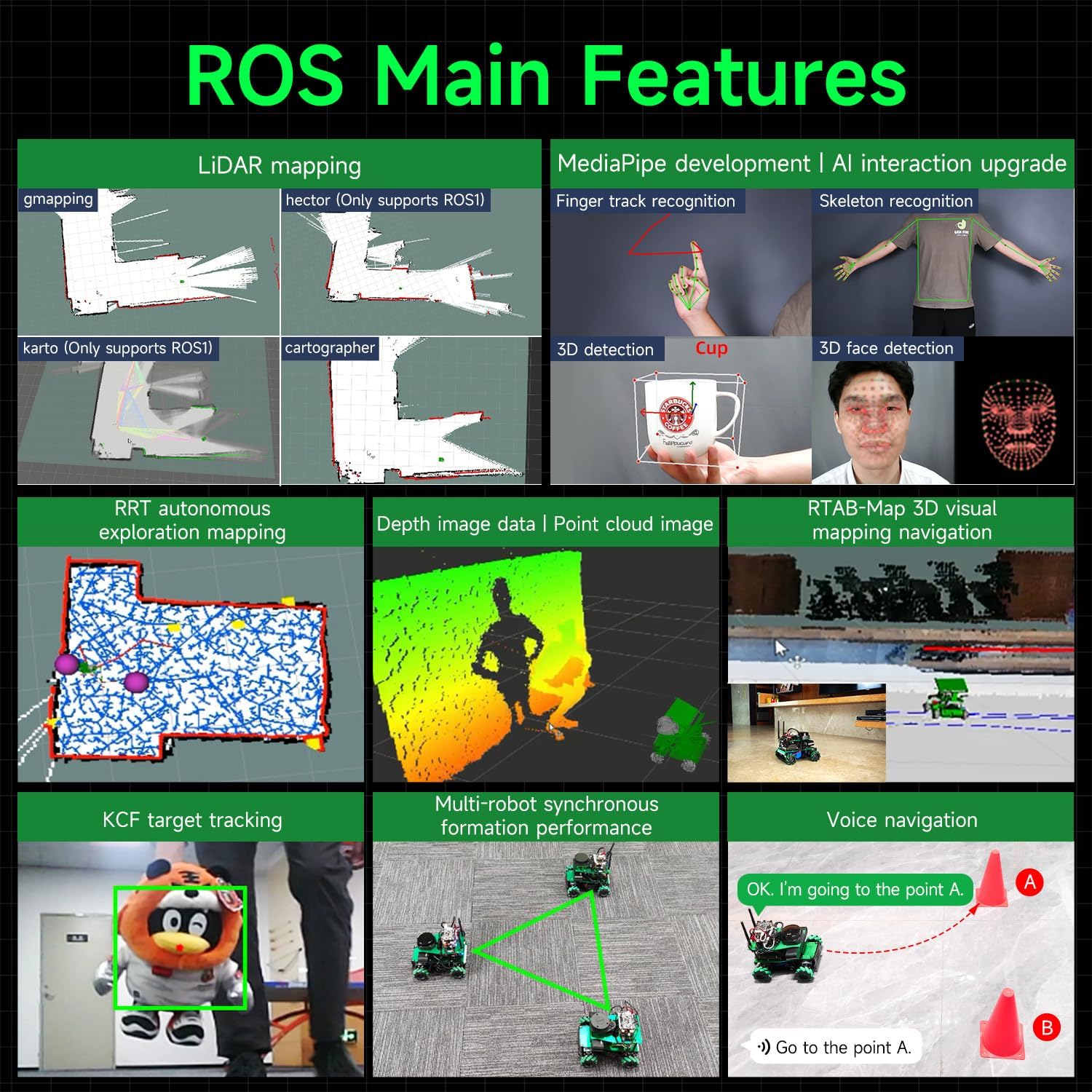 【ROS Robot Learning Kit】The newly upgraded version is compatible with Orin Nano SUPER and Orin NX SUPER robot kits, and can provide stable power for the SUPER kits. We provide 5 ROS X3 development board versions, and multiple accessory versions are available. Orin Nano SUPER, Orin NX SUPER, Jetson Nano and RPi5. The performance issues of different development boards are different. 【AI Visual Explore】Equipped with ROS1/ROS2 operating system; ridar: can use voice to control multi-point navigation, supporting path planning and independent exploration and mapping;RTAB-3D mapping and navigation, and depth image data can be used to obtain real size information; AI visual depth gameplay: attitude detection, overall detection, and three-dimensional detection and recognition can be completed through MediaPipe development; YOLO model training, TensorRT. 【Multi-platform control】Compatible with a variety of remote control methods, including mobile phone remote control APP, game controller, ROS system, PC computer keyboard and Jupyter Lab control, etc. Suitable for multi-scene control use. *Mobile APP control supports iOS/Android. Compatible with ROS1/ROS2, Ubuntu22.04 【Excellent hardware configuration】Aluminum alloy chassis, 360° omnidirectional Mecanum wheel, all-round movable robot; optional radar, high-quality depth camera, voice alternation module, display screen, professionally designed expansion according to different versions panel. Professional ROS robot supports more DIY development. Users can re-develop existing courses and learn from them.(If you would like custom accessories, please contact Yahboom) 【Rich materials and technical support】Provide 204 bilingual video courses and online technical help. The course content includes: ROSMASTER X3 assembly, Linux operating system, ROS and openCV series courses, depth camera and radar exploration, which is a deep learning process. From pictorial navigation lectures and simple to deep learning measured navigation. Material website: http://www.yahboom.net/study/ROSMASTER-X3 | قیمت یورویی : 1485€