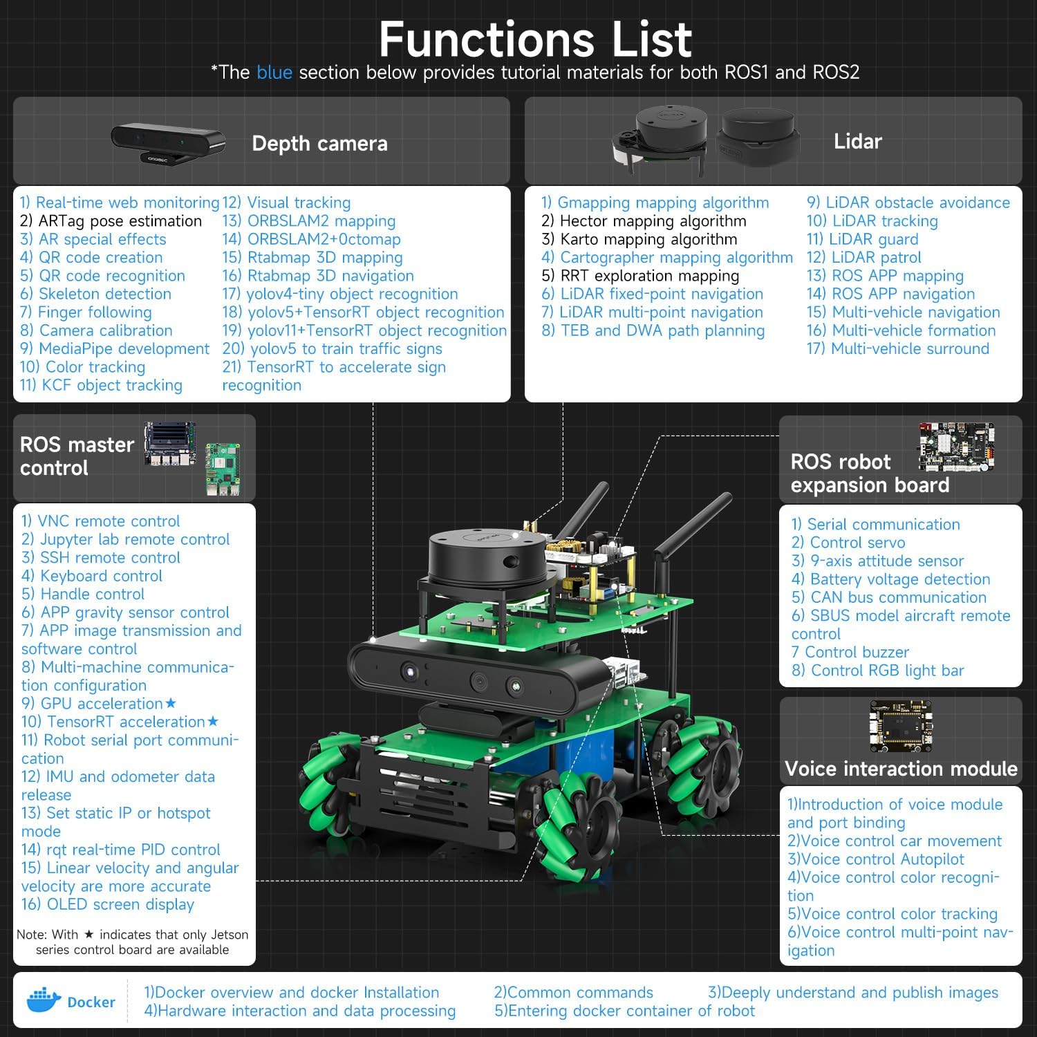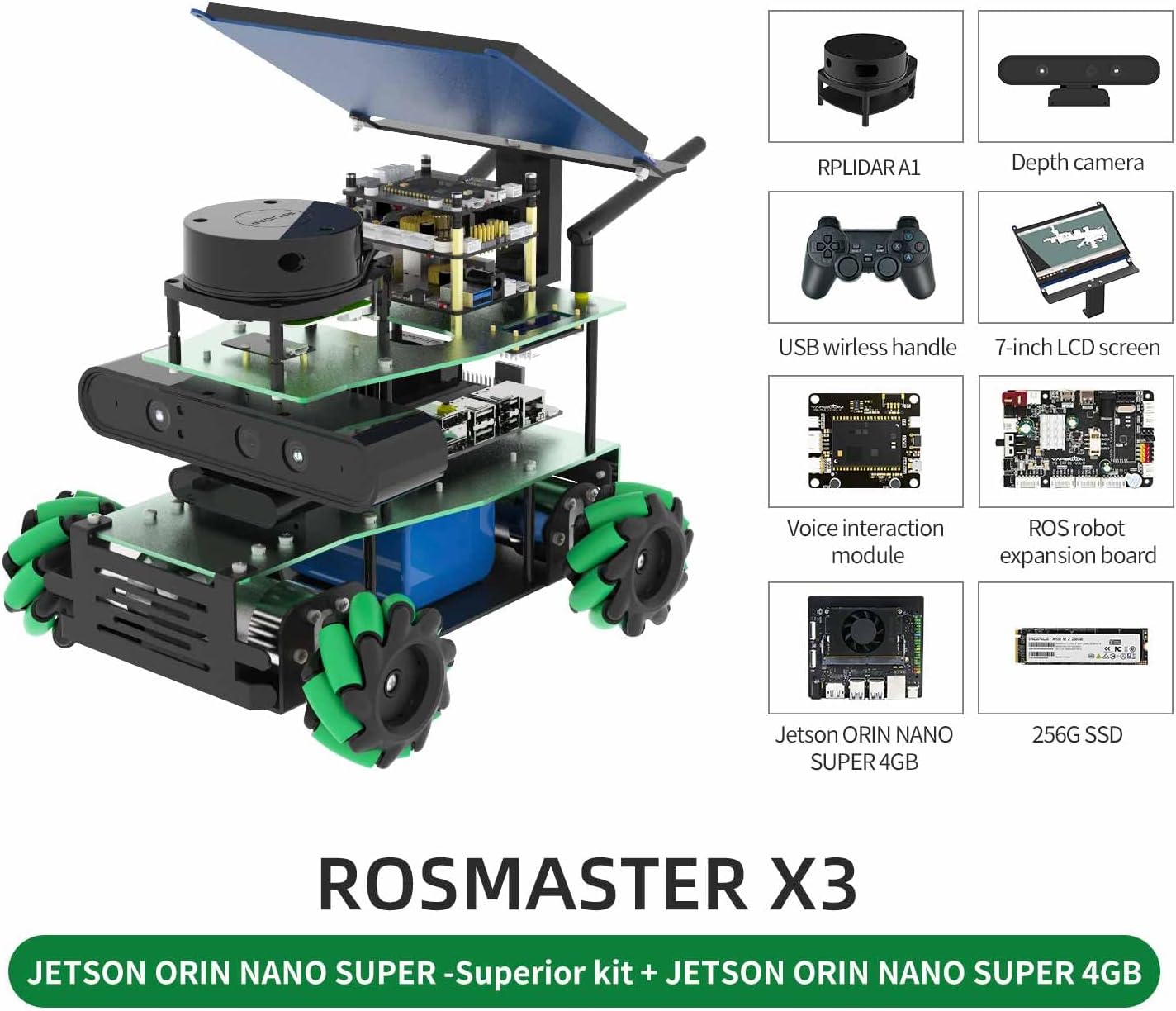 【ROS Robot Learning Kit】The newly upgraded version is compatible with Orin Nano SUPER and Orin NX SUPER robot kits, and can provide stable power for the SUPER kits. We provide 5 ROS X3 development board versions, and multiple accessory versions are available. Orin Nano SUPER, Orin NX SUPER, Jetson Nano and RPi5. The performance issues of different development boards are different. 【AI Visual Explore】Equipped with ROS1/ROS2 operating system; ridar: can use voice to control multi-point navigation, supporting path planning and independent exploration and mapping;RTAB-3D mapping and navigation, and depth image data can be used to obtain real size information; AI visual depth gameplay: attitude detection, overall detection, and three-dimensional detection and recognition can be completed through MediaPipe development; YOLO model training, TensorRT. 【Multi-platform control】Compatible with a variety of remote control methods, including mobile phone remote control APP, game controller, ROS system, PC computer keyboard and Jupyter Lab control, etc. Suitable for multi-scene control use. *Mobile APP control supports iOS/Android. Compatible with ROS1/ROS2, Ubuntu22.04 【Excellent hardware configuration】Aluminum alloy chassis, 360° omnidirectional Mecanum wheel, all-round movable robot; optional radar, high-quality depth camera, voice alternation module, display screen, professionally designed expansion according to different versions panel. Professional ROS robot supports more DIY development. Users can re-develop existing courses and learn from them.(If you would like custom accessories, please contact Yahboom) 【Rich materials and technical support】Provide 204 bilingual video courses and online technical help. The course content includes: ROSMASTER X3 assembly, Linux operating system, ROS and openCV series courses, depth camera and radar exploration, which is a deep learning process. From pictorial navigation lectures and simple to deep learning measured navigation. Material website: http://www.yahboom.net/study/ROSMASTER-X3 | قیمت یورویی : 1199€