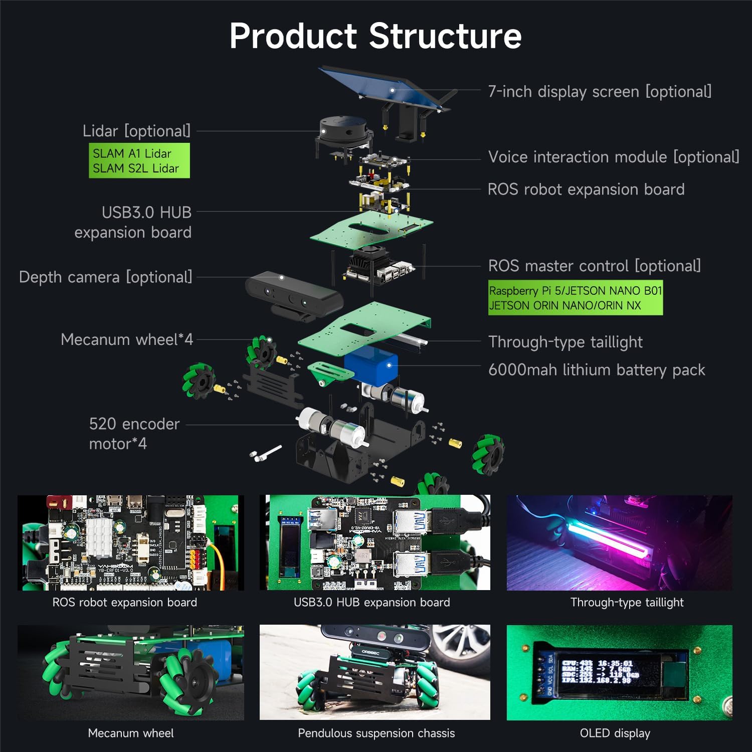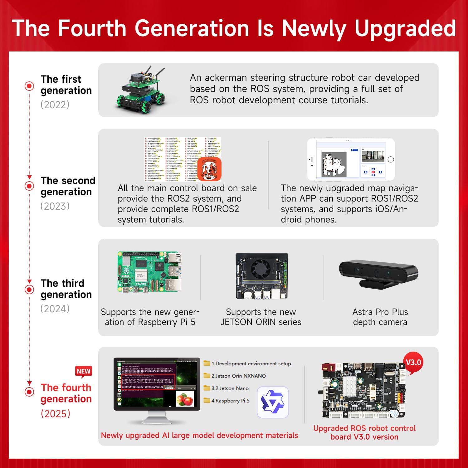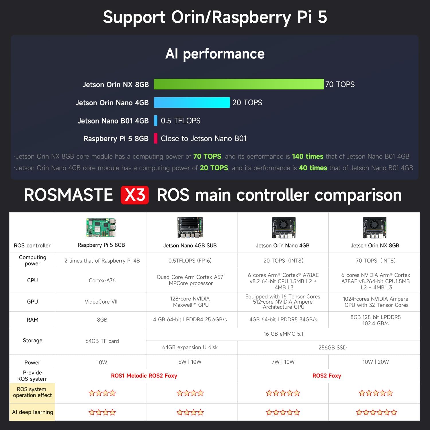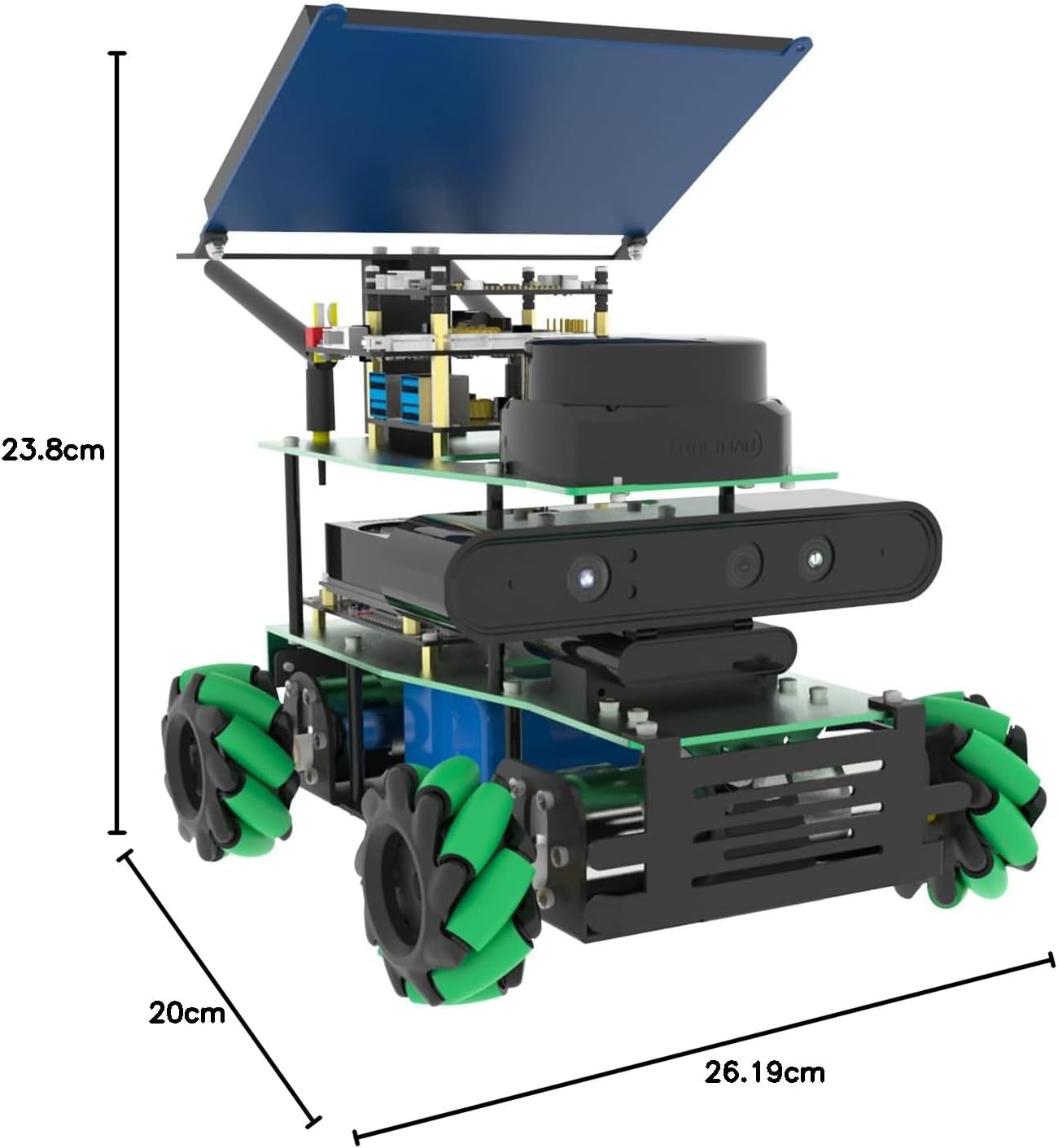 【ROS Robot Learning Kit】The newly upgraded version is compatible with Orin Nano SUPER and Orin NX SUPER robot kits, and can provide stable power for the SUPER kits. We provide 5 ROS X3 development board versions, and multiple accessory versions are available. Orin Nano SUPER, Orin NX SUPER, Jetson Nano and RPi5. The performance issues of different development boards are different. 【AI Visual Explore】Equipped with ROS1/ROS2 operating system; ridar: can use voice to control multi-point navigation, supporting path planning and independent exploration and mapping;RTAB-3D mapping and navigation, and depth image data can be used to obtain real size information; AI visual depth gameplay: attitude detection, overall detection, and three-dimensional detection and recognition can be completed through MediaPipe development; YOLO model training, TensorRT. 【Multi-platform control】Compatible with a variety of remote control methods, including mobile phone remote control APP, game controller, ROS system, PC computer keyboard and Jupyter Lab control, etc. Suitable for multi-scene control use. *Mobile APP control supports iOS/Android. Compatible with ROS1/ROS2, Ubuntu22.04 【Excellent hardware configuration】Aluminum alloy chassis, 360° omnidirectional Mecanum wheel, all-round movable robot; optional radar, high-quality depth camera, voice alternation module, display screen, professionally designed expansion according to different versions panel. Professional ROS robot supports more DIY development. Users can re-develop existing courses and learn from them.(If you would like custom accessories, please contact Yahboom) 【Rich materials and technical support】Provide 204 bilingual video courses and online technical help. The course content includes: ROSMASTER X3 assembly, Linux operating system, ROS and openCV series courses, depth camera and radar exploration, which is a deep learning process. From pictorial navigation lectures and simple to deep learning measured navigation. Material website: http://www.yahboom.net/study/ROSMASTER-X3 | قیمت یورویی : 585€