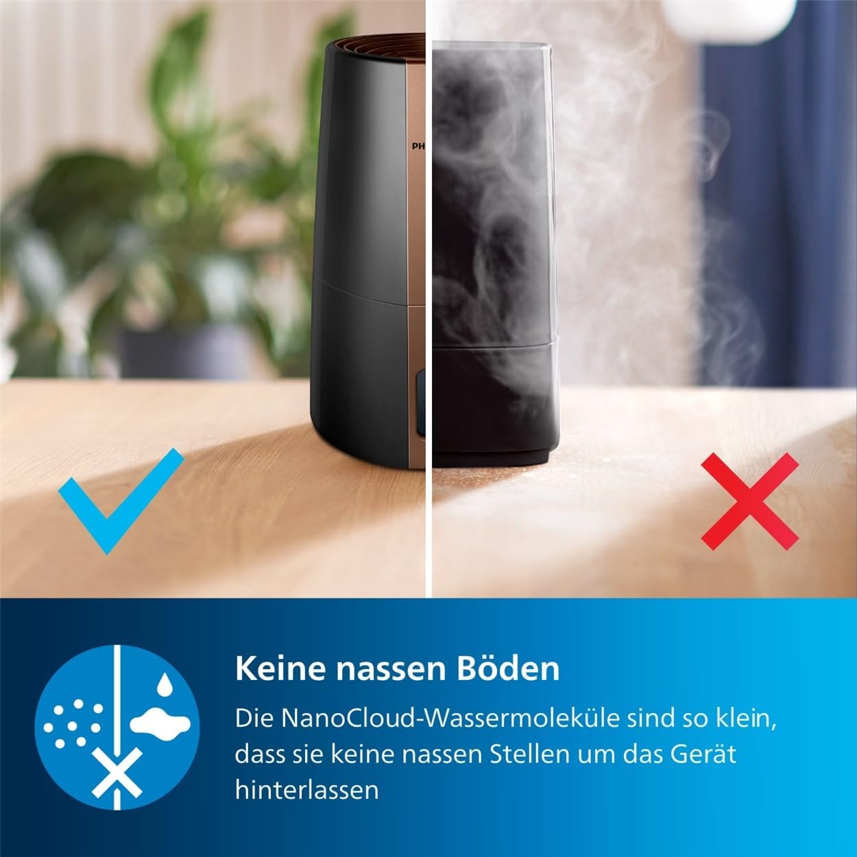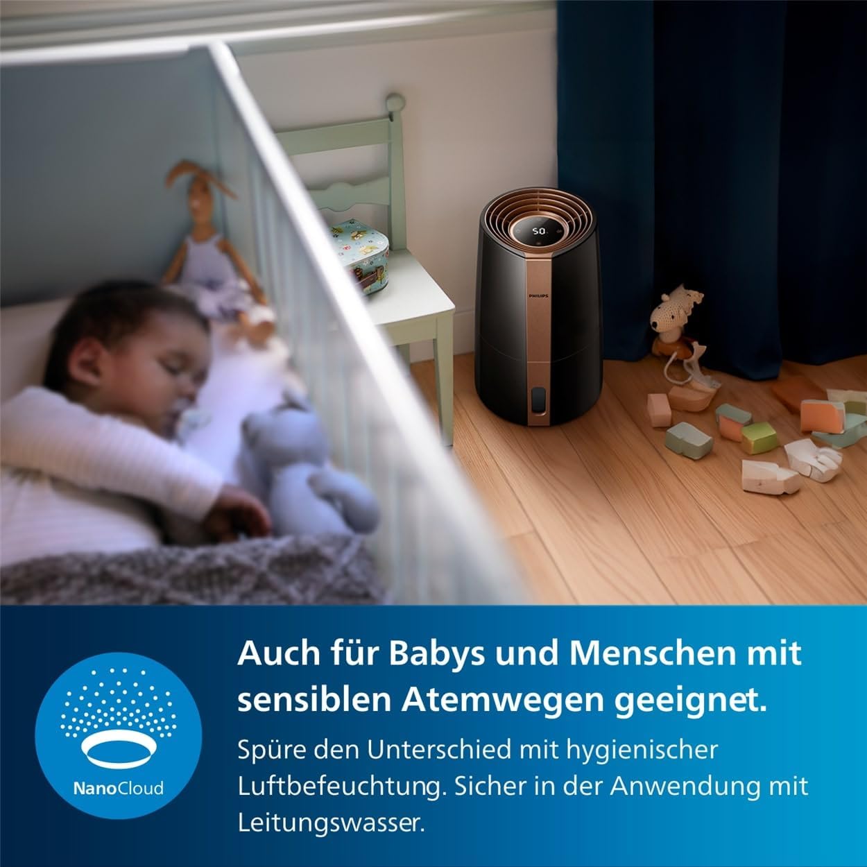 Philips Luftbefeuchter 3000, 45 m², 99,97% weniger Bakterien mit NanoCloud, 300 ml/h, 3 Geschwindigkeiten, Schlafmodus, ultra-leise (33 dB), Feuchtigkeitssensor, Timer, 3L Tank, schwarz (HU3918/10) | قیمت یورویی 109€