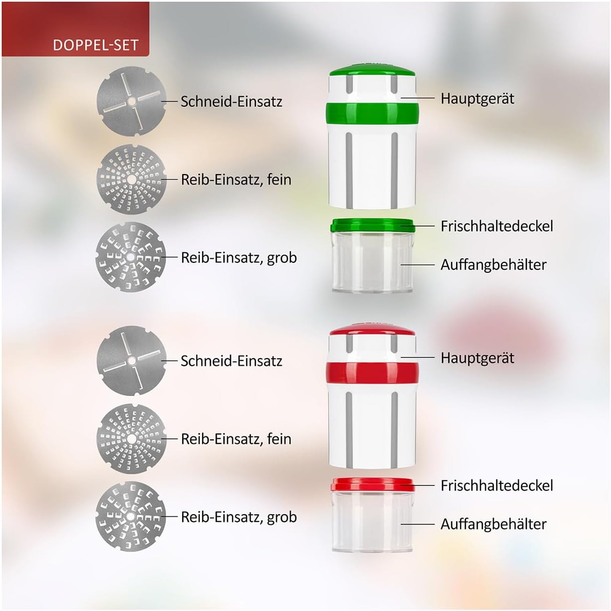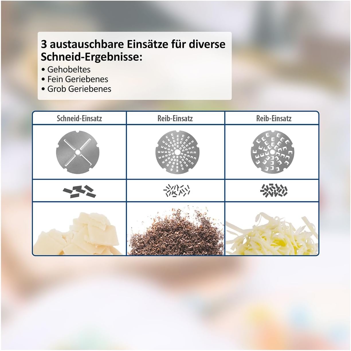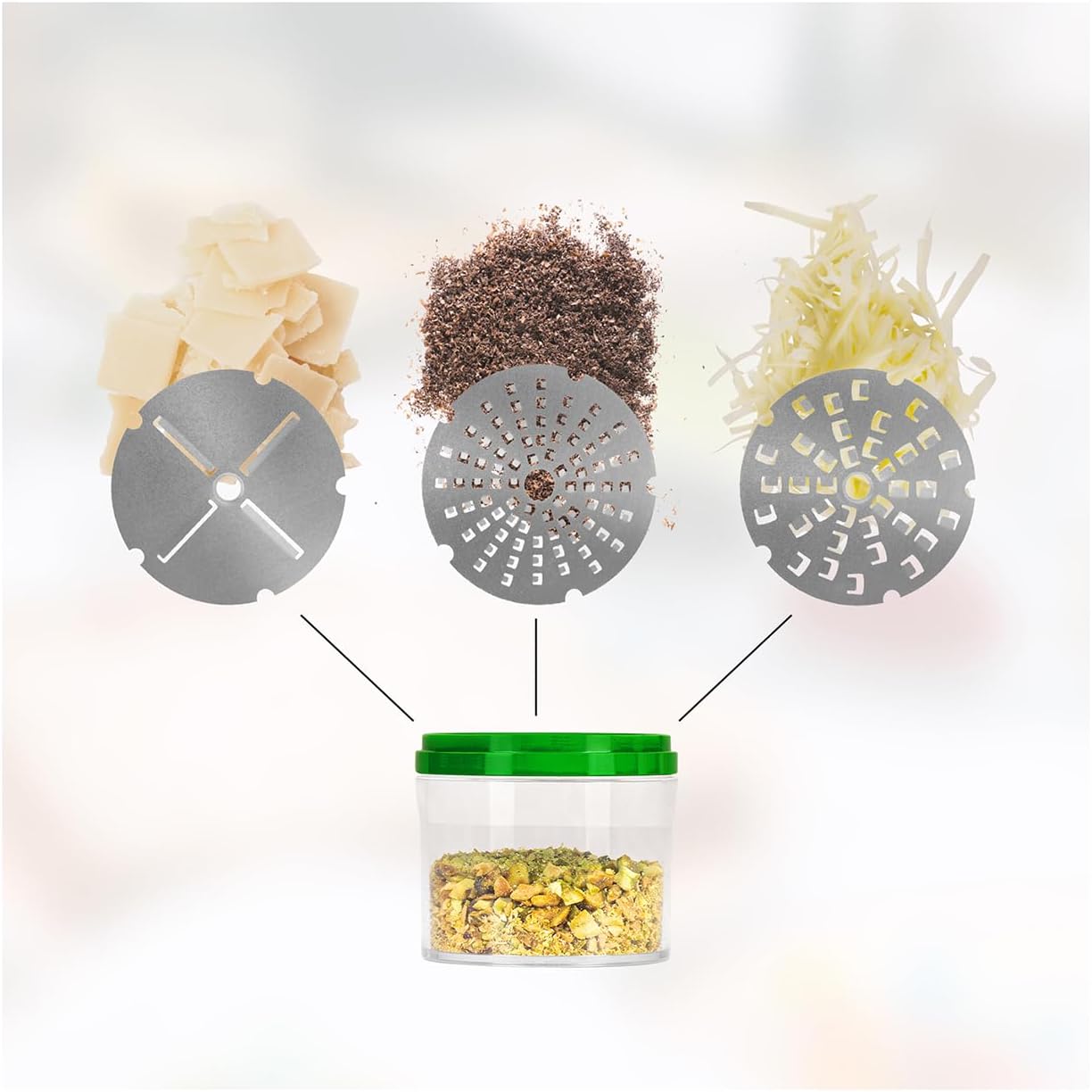 Gewürzmühle mit absoluter Sicherheit: Die Finger kommen nicht in Kontakt mit den Klingen Küchenreibe für Käse und Gewürze - Extra-scharfe Edelstahl-Klingen in G-NOX-Qualität Einsätze direkt im Hauptgerät aufbewahren Praktischer Frischhaltedeckel zum Verschließen des Auffangbehälters – ideal zum Frischhalten, Aufbewahren und Transportieren Perfekt zum Verarbeiten von Käse, Nüssen, Schokolade, Gewürzen und mehr | قیمت یورویی : 44.94€