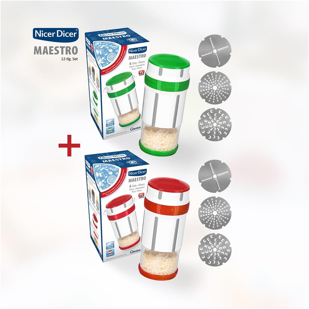 رنده پنیر آسیاب ادویه Genius Nicer Dicer Maestro با 3 تیغه بزرگ 12 عدد، آسیاب جوز هندی، رنده پارمزان با ظرف و درب، خلال پنیر، رنده سیر، رنده آشپزخانه با انبار
