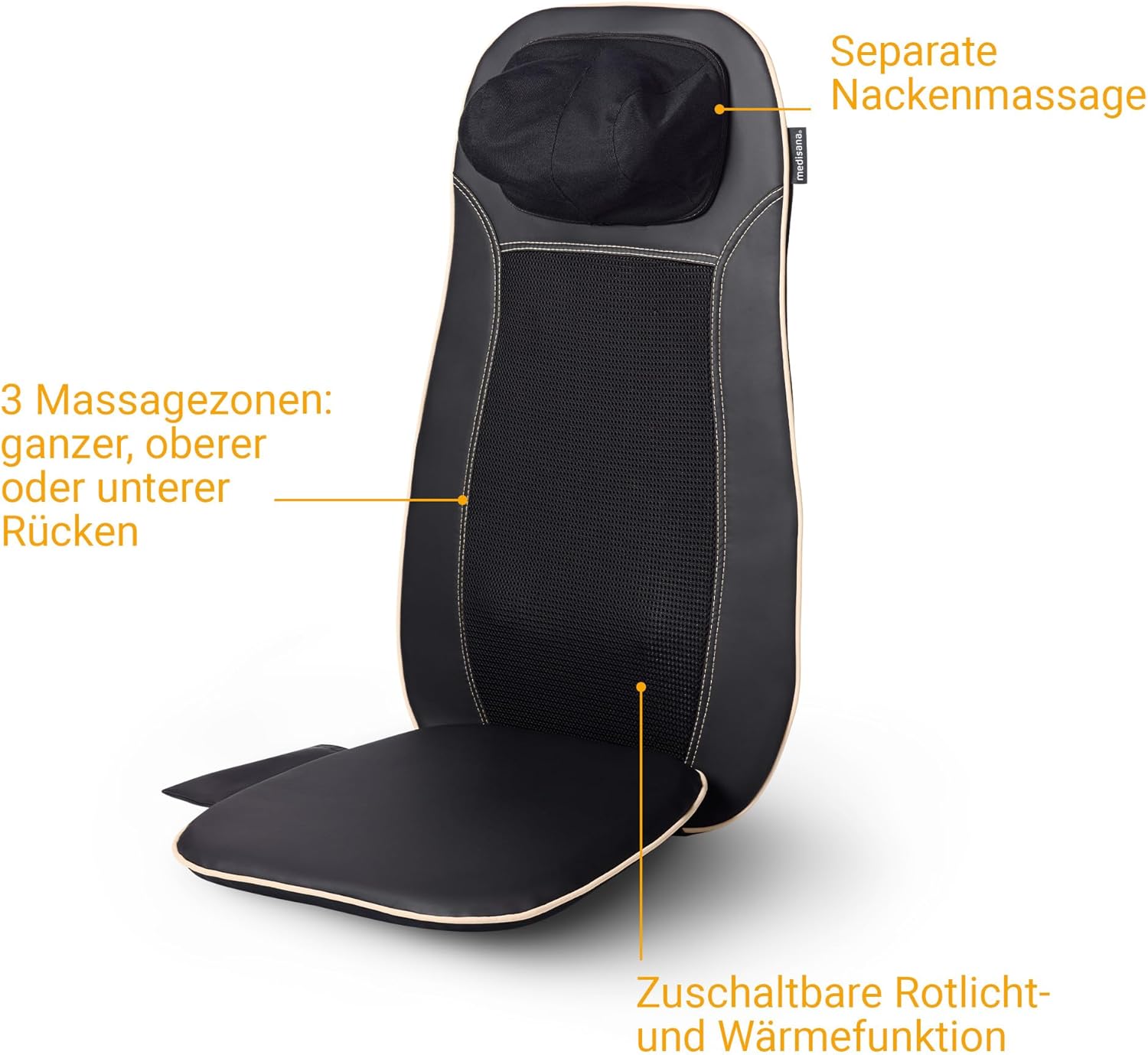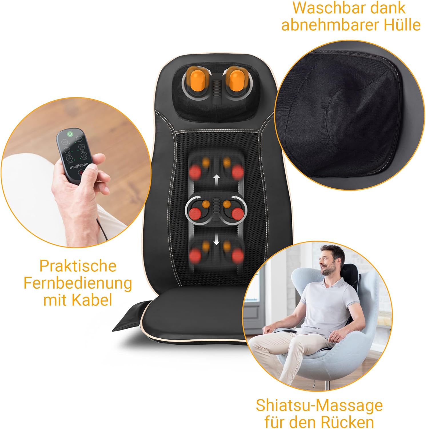 3 Massagezonen: Sie können bei der MCN Shiatsu-Massagesitzauflage auswählen, welchen Bereich Sie massieren lassen möchten: den oberen, unteren oder gesamten Rücken Shiatsu-Massage: Die einzigartige Kombination aus intensiver Shiatsu-Massage und milder Wärme ermöglicht eine wirkungsvolle und entspannende Anwendung. Die zusätzliche Spotmassage lässt gezielte Regionen massieren Wärme & Rotlichtfunktion: Die zusätzliche integrierte zuschaltbare Rotlicht- und Wärmefunktion sorgt zusätzlich für Ihr Wohlbefinden Einfache Handhabung: Egal wo Sie sich gerade befinden. Unsere MCN Massagesitzauflage lässt sich Zuhause sowie auch im Büro nutzen Hinweis: Bitte benutzen Sie die Sitzauflage nicht während der Fahrt oder im Liegen. Die Massagewirkung kann variieren und von jeder Person leichter oder stärker wahrgenommen werden. Bitte entfernen Sie vor Gebrauch die Transportsicherungen | قیمت یورویی : 74.99€