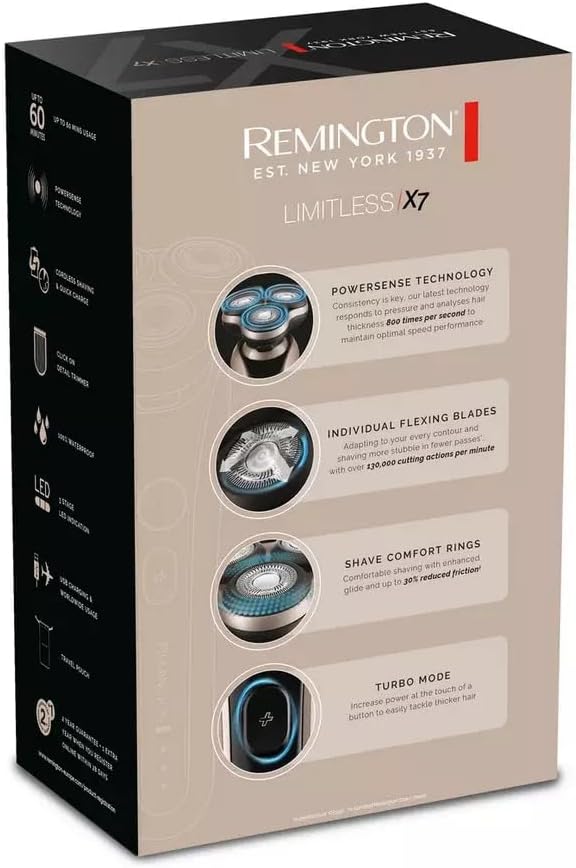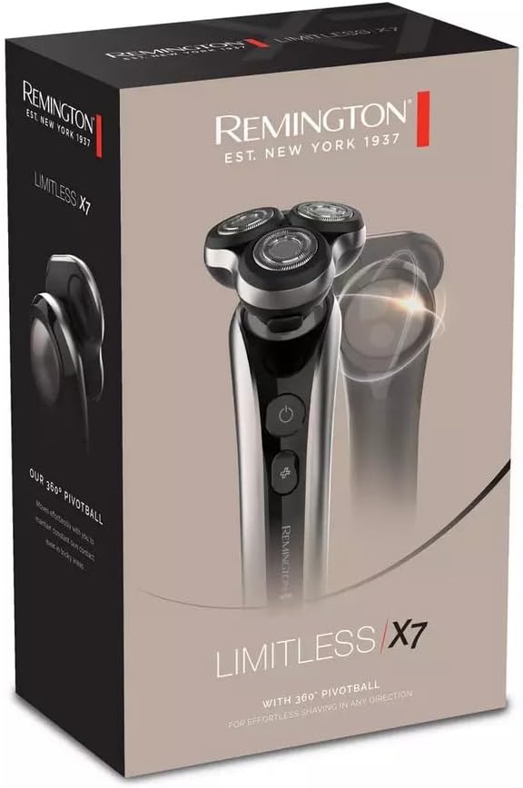 Remington XR1770 Limitless X7 Rotationsrasierer لینک آمازون : https://www.amazon.de/dp/B0F7LSJN3K?th=1&psc=1 فناوری PivotBall 360 درجه برای بهبود مانورپذیری فناوری PowerSense سرعت را بر اساس ضخامت مو تنظیم میکند. حلقههای راحتی اصلاح، اصطکاک را برای سر خوردن روان کاهش میدهند. طراحی ۱۰۰٪ ضد آب برای استفاده خشک و مرطوب شارژ از طریق USB با ۹۰ دقیقه زمان شارژ و ۶۰ دقیقه زمان استفاده