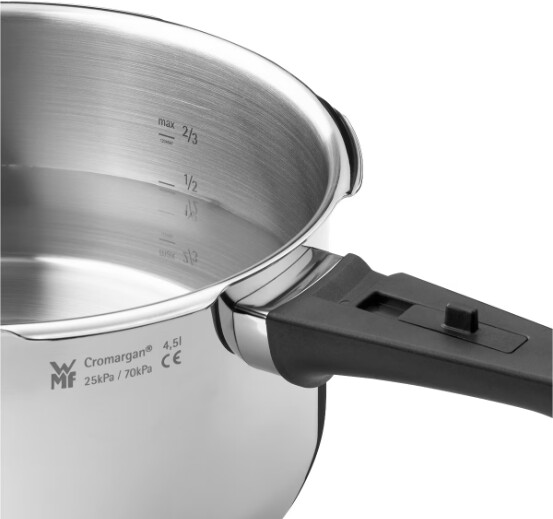 زودپز WMF Perfect 2.5L، یک انتخاب بسیار مناسب برای تهیه غذاهای سریع و سالم در حجم کم است. بدنهی استیل ضدزنگ Cromargan® 18/10 باعث مقاومت بالا در برابر زنگزدگی و خط و خش میشود. طراحی کف TransTherm® به آن امکان استفاده بر روی تمامی اجاقها، از جمله القایی را میدهد. این زودپز با دریچه کنترل فشار، قفل ایمنی درب و خروج بخار اتوماتیک، حداکثر ایمنی را برای کاربران فراهم میکند.