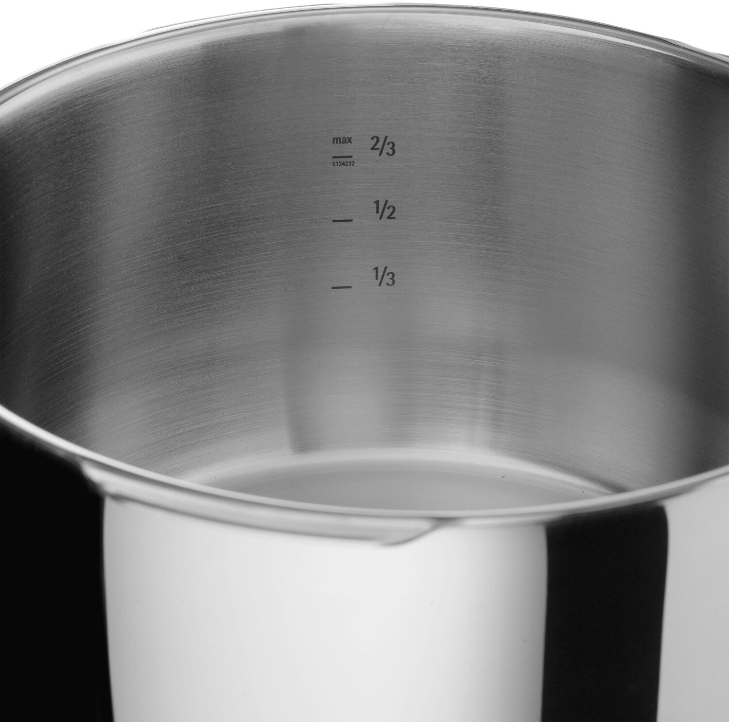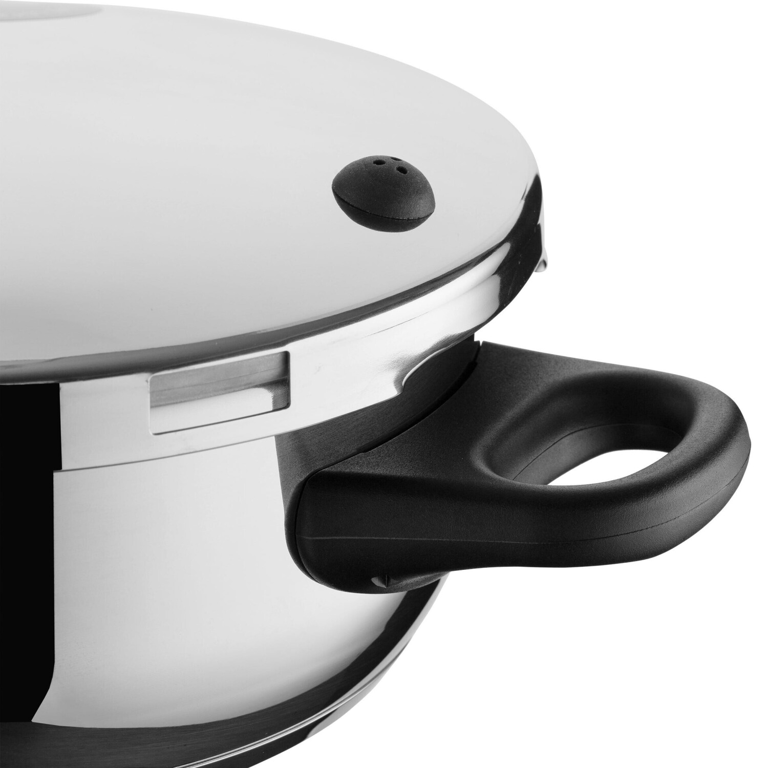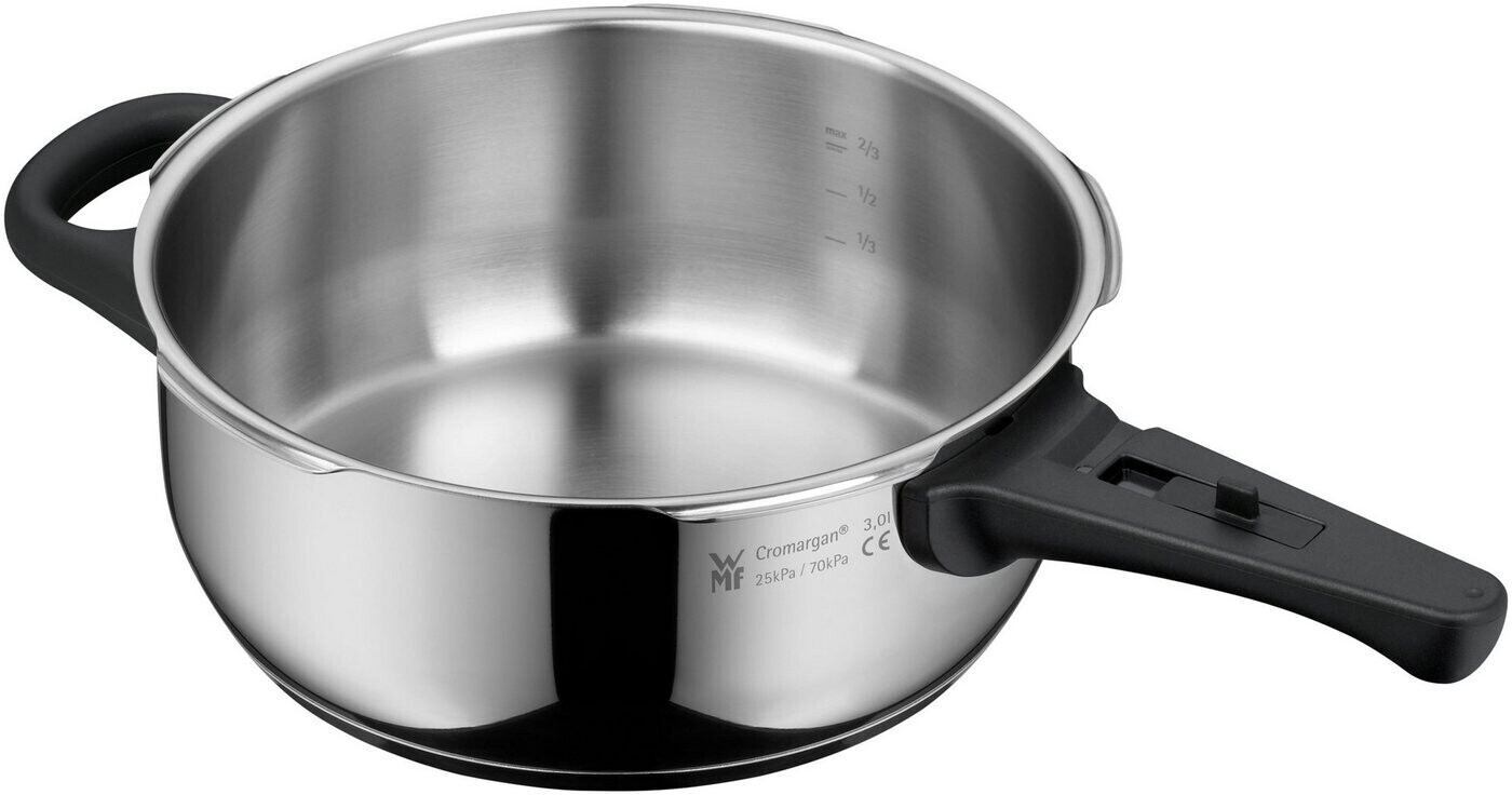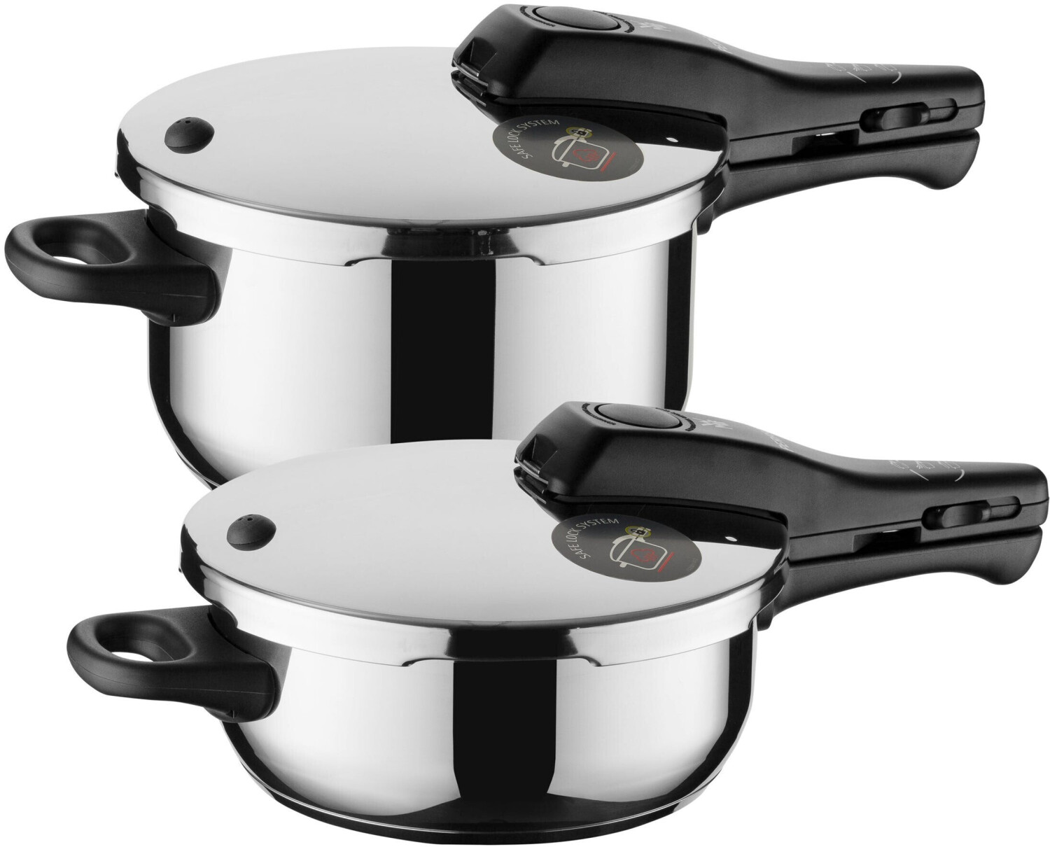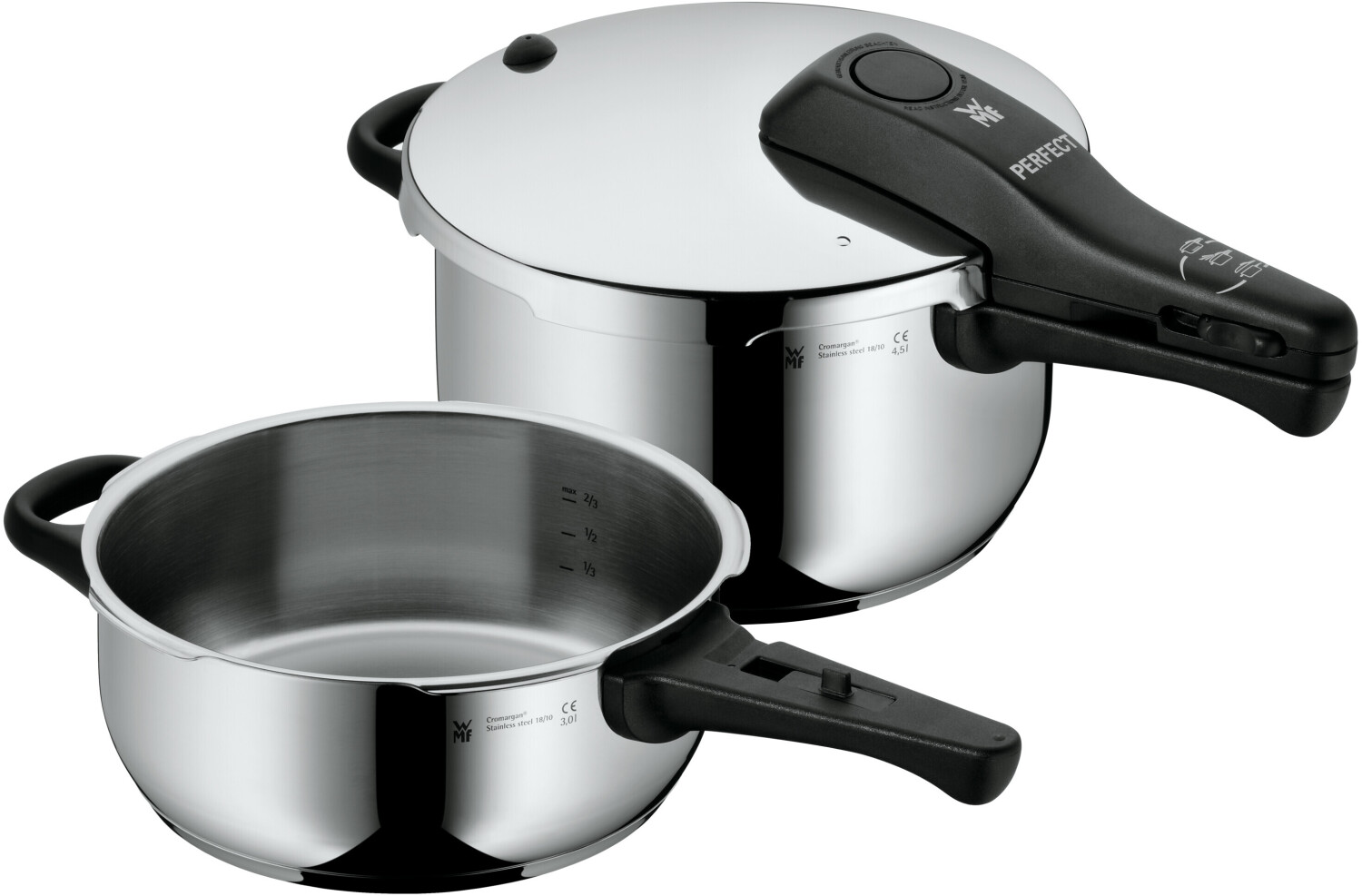 زودپز دو تکه WMF Perfect Schnellkochtopf-Set شامل یک قابلمه ۳ لیتری و یک قابلمه ۴.۵ لیتری است که با یک درب زودپز مشترک، امکان پخت سریع، سالم و متنوع را فراهم میکند. این مجموعه ساختهشده از استیل ضدزنگ Cromargan® 18/10 با کفی TransTherm®، برای تمامی اجاقها، از جمله القایی، قابل استفاده است.