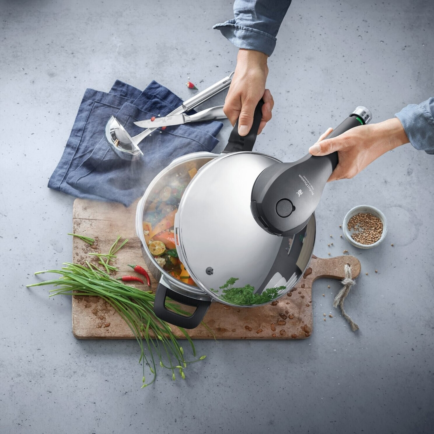 WMF Perfect Premium Schnellkochtopf-Set با سیستم TransTherm®، که قابلیت توزیع حرارت یکنواخت را فراهم میکند، برای اجاقهای گازی، الکتریکی و القایی مناسب است. علاوه بر این، دریچه فشار خودکار و سیستم ایمنی قفل درب برای استفاده آسان و بدون نگرانی در نظر گرفته شده است.