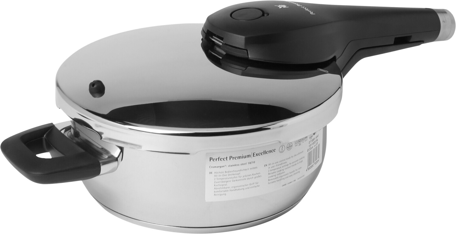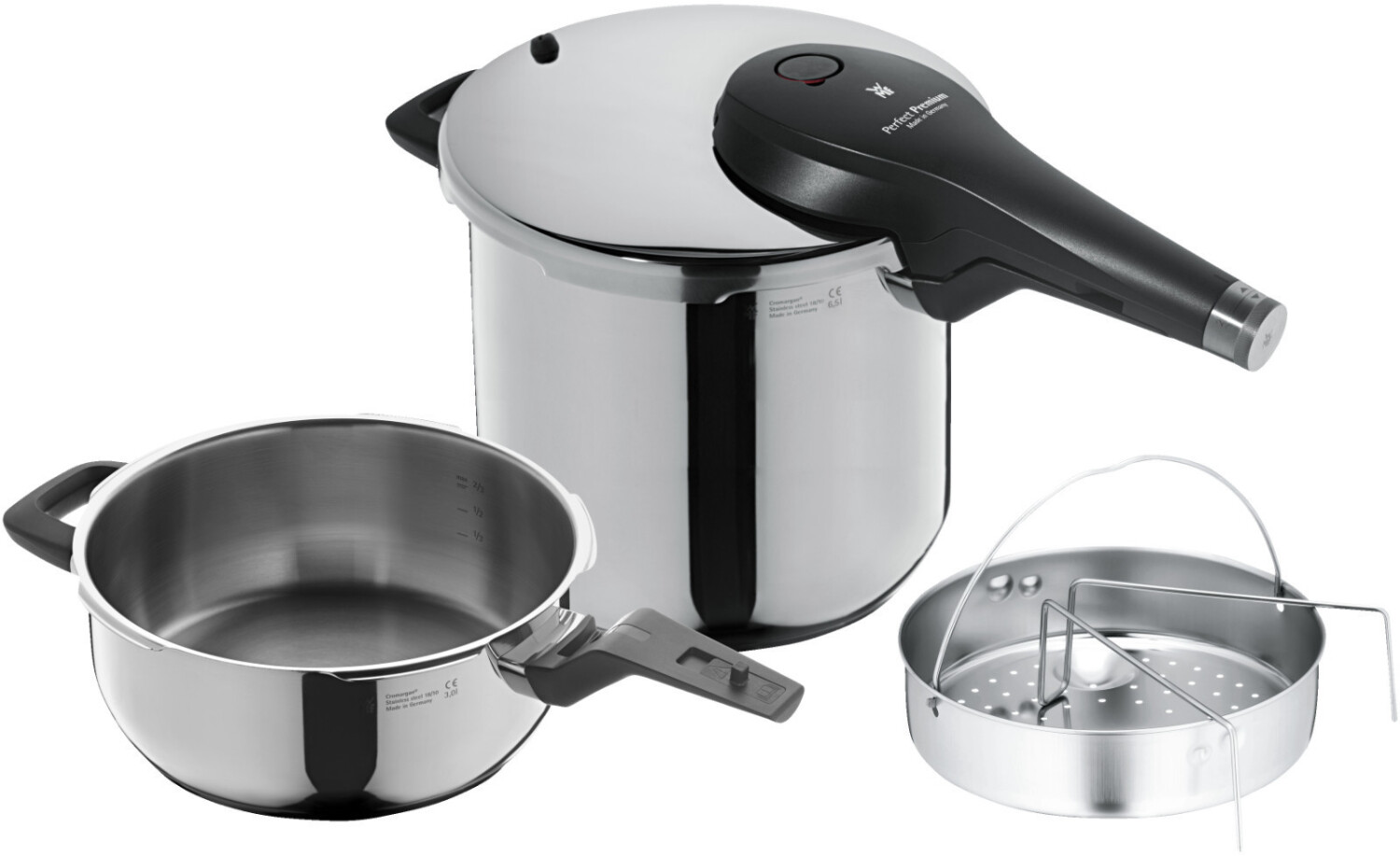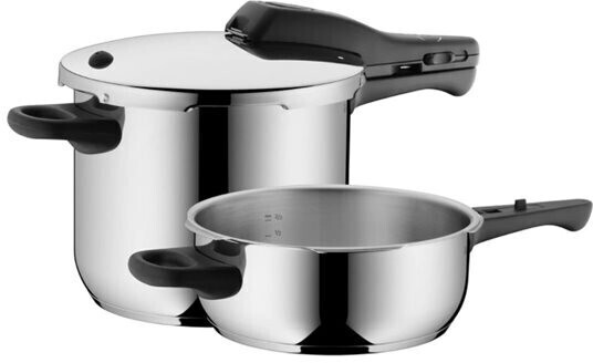 ست زودپز WMF Perfect Premium با ۲ قابلمه در اندازههای ۳ و ۶.۵ لیتری، عملکرد سریع و ایمن را برای پخت انواع غذاها فراهم میکند. دستگیره ارگونومیک جداشونده، قابلیت استفاده روی تمامی اجاقها از جمله القایی و فناوری TransTherm® برای پخش یکنواخت حرارت، از ویژگیهای برجسته این مدل هستند.