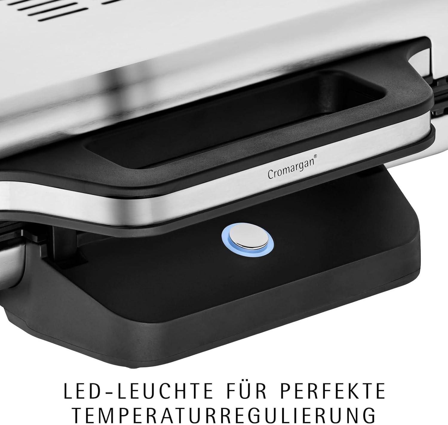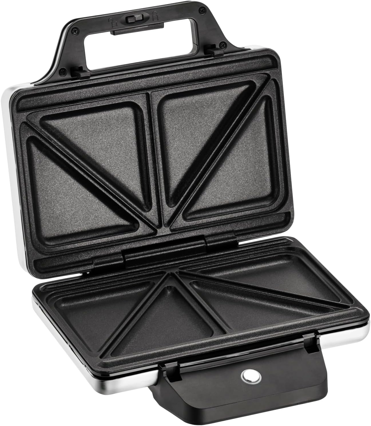 Vielseitige Sandwichvielfalt: Der Sandwichmaker bietet Platz für zwei Sandwiches, ob Standard oder XXL Toast – optmial für jede Toastsorte Kinderleichte Bedienung: Mit Ein- und Ausschaltknopf und LED-Leuchte für optmiale Temperaturregulierung – von Rot auf Weiß zeigt die passende Temperatur an Individuelle Anpassung: Dank variabler Griff-Verriegelung und 2-stufiger Höhenanpassung ist der Sandwichmaker optmial für unterschiedlich dicke Sandwiches Platzsparende Aufbewahrung: Integrierte Kabelaufwicklung und Steckerdepot ermöglichen vertikale Lagerung für eine ordentliche Küche Langlebiges Design: Robuste Cromargan Edelstahlkonstruktion und antihaftbeschichtete Platten sorgen für leichte Reinigung und lange Haltbarkeit Schnell und praktisch: Für spontane Sandwichkreationen, unabhängig von Toastgröße oder Belag – Snacks in kürzester Zeit zubereitet | قیمت یورویی : 64.9€