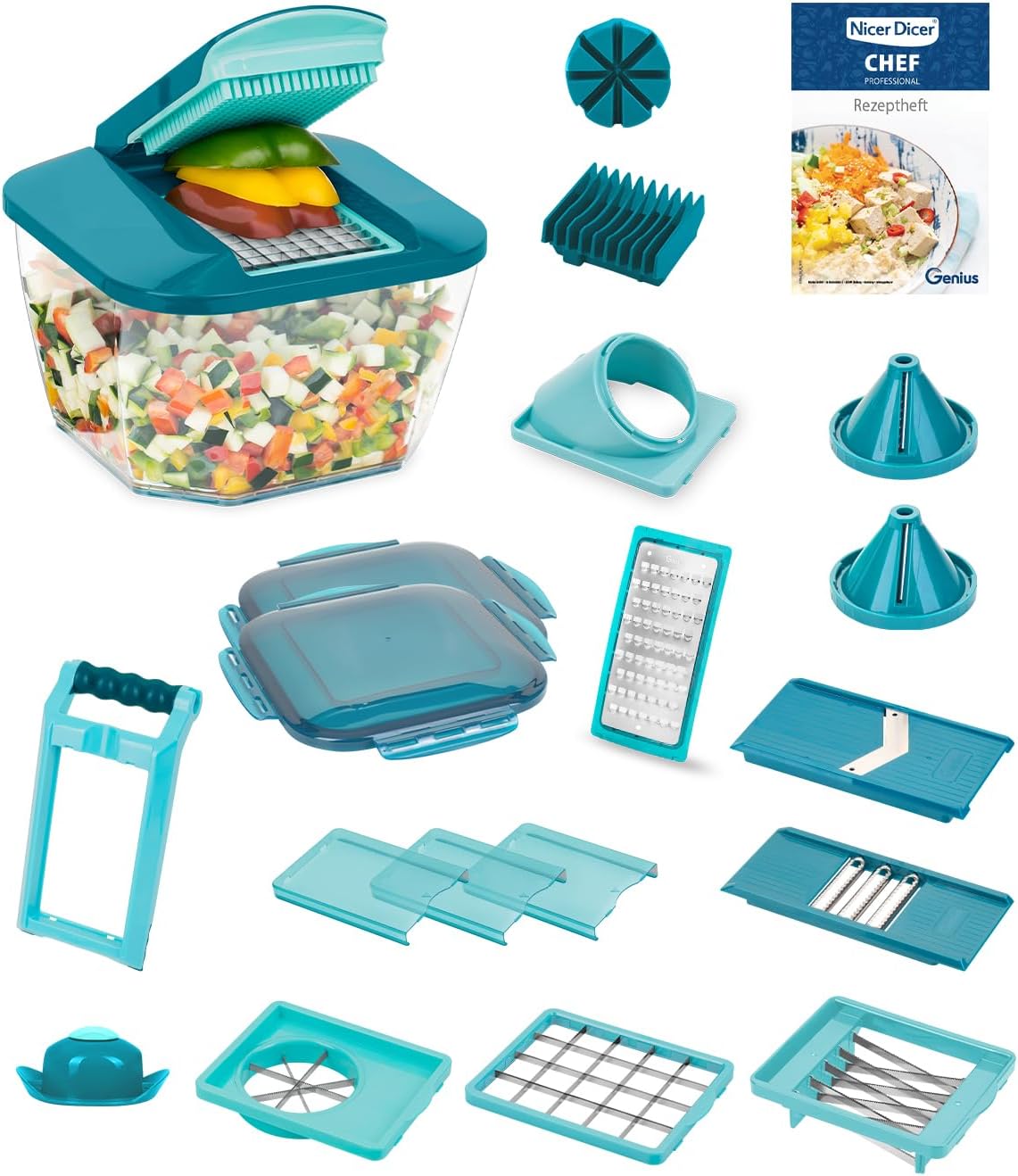 Nicer Dicer Chef Professional Gemüsescheider 23-tlg. Gemüsehobel manuell mit 5.2L großem Auffangbehälter Frischhaltedeckel, Spiraleinsätze, Tomatenschneider, Julienne, Salatschneider mit Rezeptbuch | قیمت یورویی 66.99€