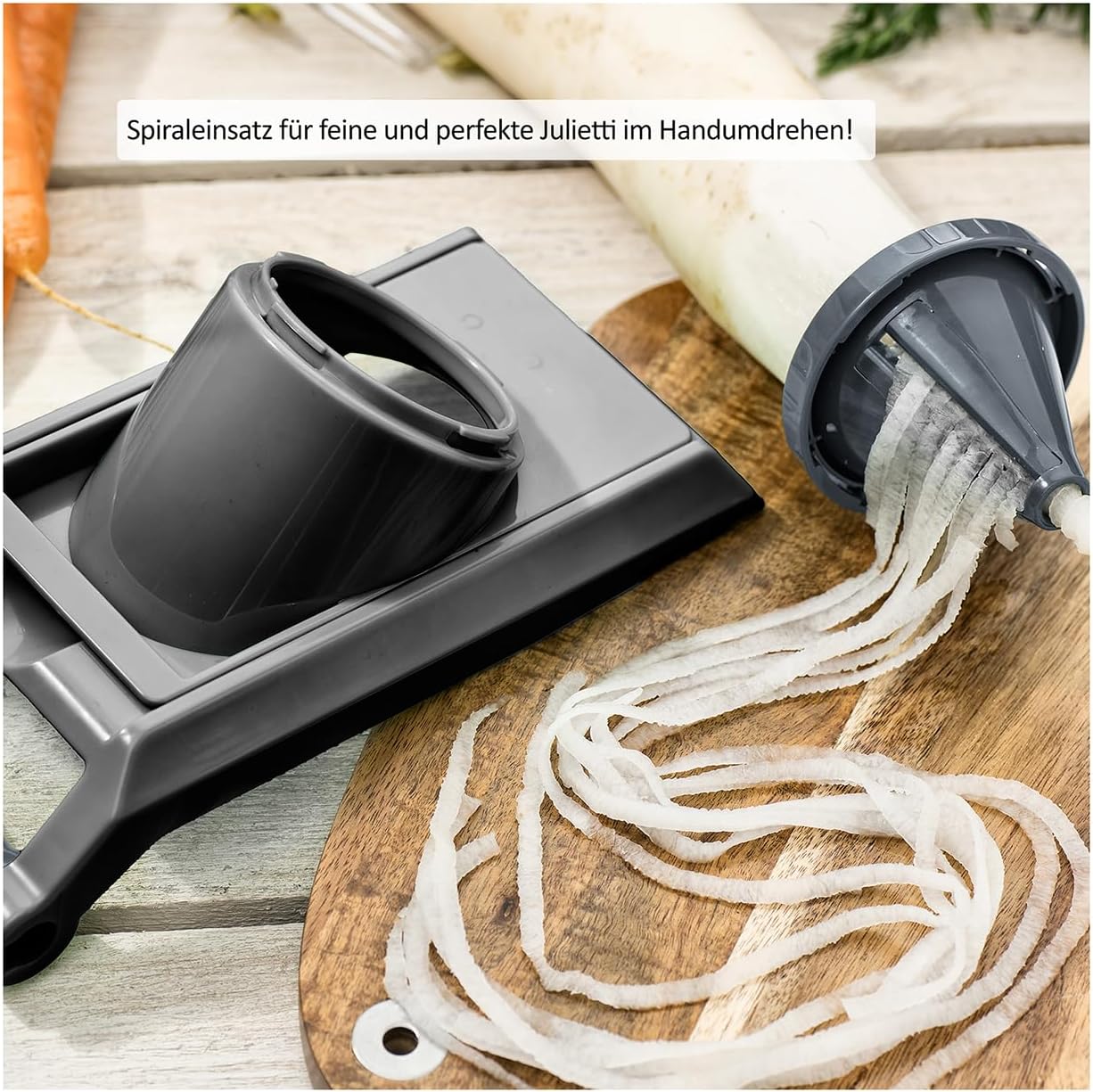 Nicer Dicer Chef Gemüseschneider 15.tlg, Gemüsehobel Zwiebelschneider, Salatschneider, Würfelschneider Pommesschneider Wellenschneider, Multizerkleiner für Obst Gemüse Küchehelfer mit Rezept لینک آمازون : https://www.amazon.de/dp/B0DJPNKNTC?th=1&psc=1 تنوع سالم، با کیفیت و کار آسان تر – این همان چیزی است که نسل دهم Nicer Dicer مخفف آن است! مکعب ها، چوب ها، برش ها، نوارها، ژولیتیس (اسپاگتی سبزیجات) را برش دهید و درشت رنده کنید - همه در یک دستگاه! ظرف جمع آوری و کاسه سرو 2 در 1 XXL! تلاش کمتر به لطف اهرم بهینه شده! تمیز کردن آسان به لطف عملکرد خود تمیز شوندگی! این مجموعه شامل: 1 عدد قسمت فوقانی برش 1 x قسمت پایینی 1 عدد ظرف جمع آوری (ظرفیت: 3300 میلی لیتر) 1 عدد درب تازه نگهدارنده 1 عدد درج تیغه 12 x 12 میلی متر 1 عدد درج تیغه 24 x 24 میلی متر 1 عدد برش گوجه فرنگی و سبزیجات (9 میلی متر برای برش گره 9 میلی متری و سبزیجات 9 میلی متر) سرت، درشت، شامل پوشش محافظ 1 عدد برش، ثابت، شامل محافظ تیغه 1 عدد نگهدارنده غذا، 1 عدد درج قاب برای Nicer Julietti 1 عدد درج مارپیچ با تیغه جولیتی 1x جزوه دستور پخت