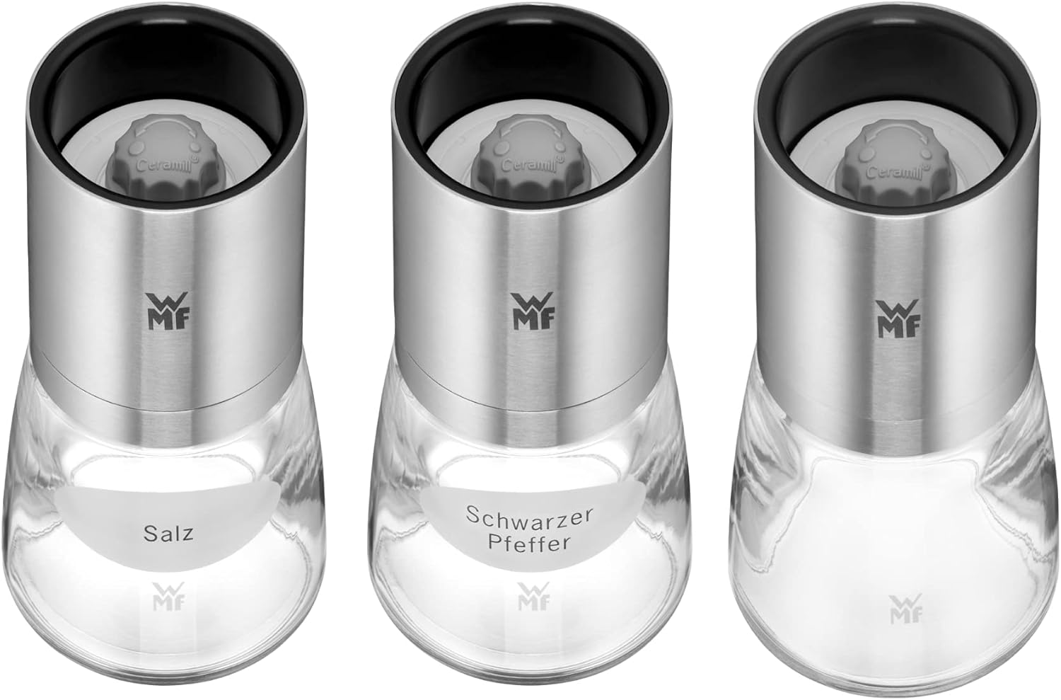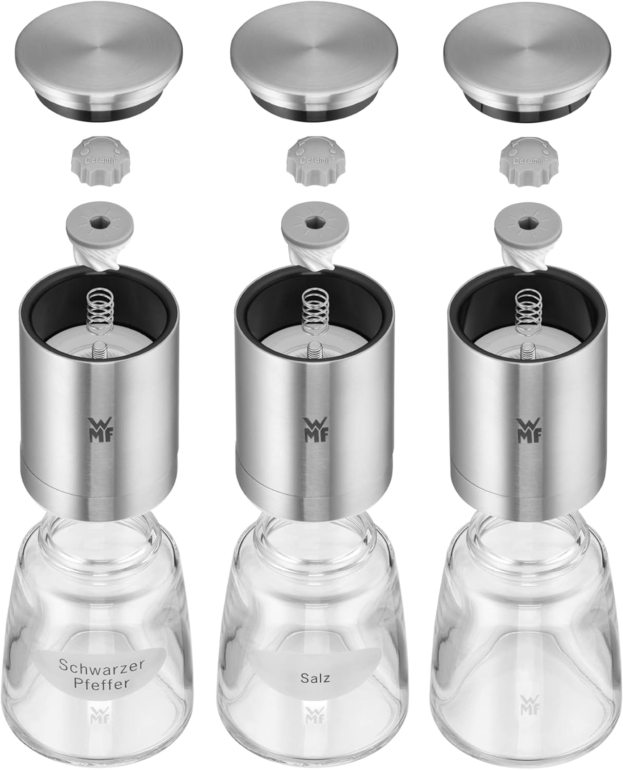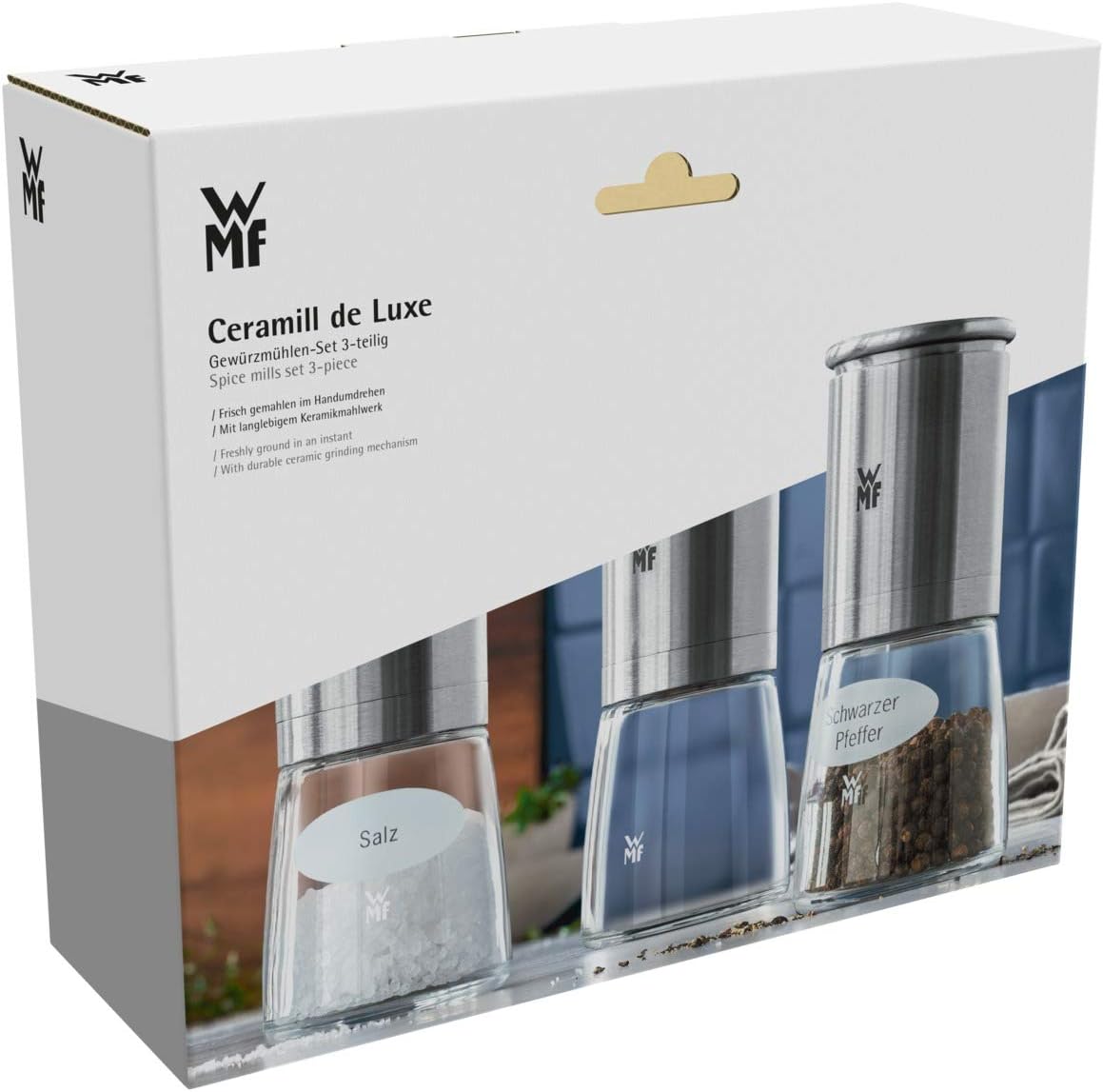 WMF De Luxe Salz und Pfeffermühle Set 3-teilig, befüllt, Cromargan Edelstahl matt, Glas, stufenlose Einstellung der Mahlstärke, Keramikmahlwerk, Grinder für Salz, Pfeffer, Gewürze 3-teilig Transparent | قیمت یورویی 47.99€