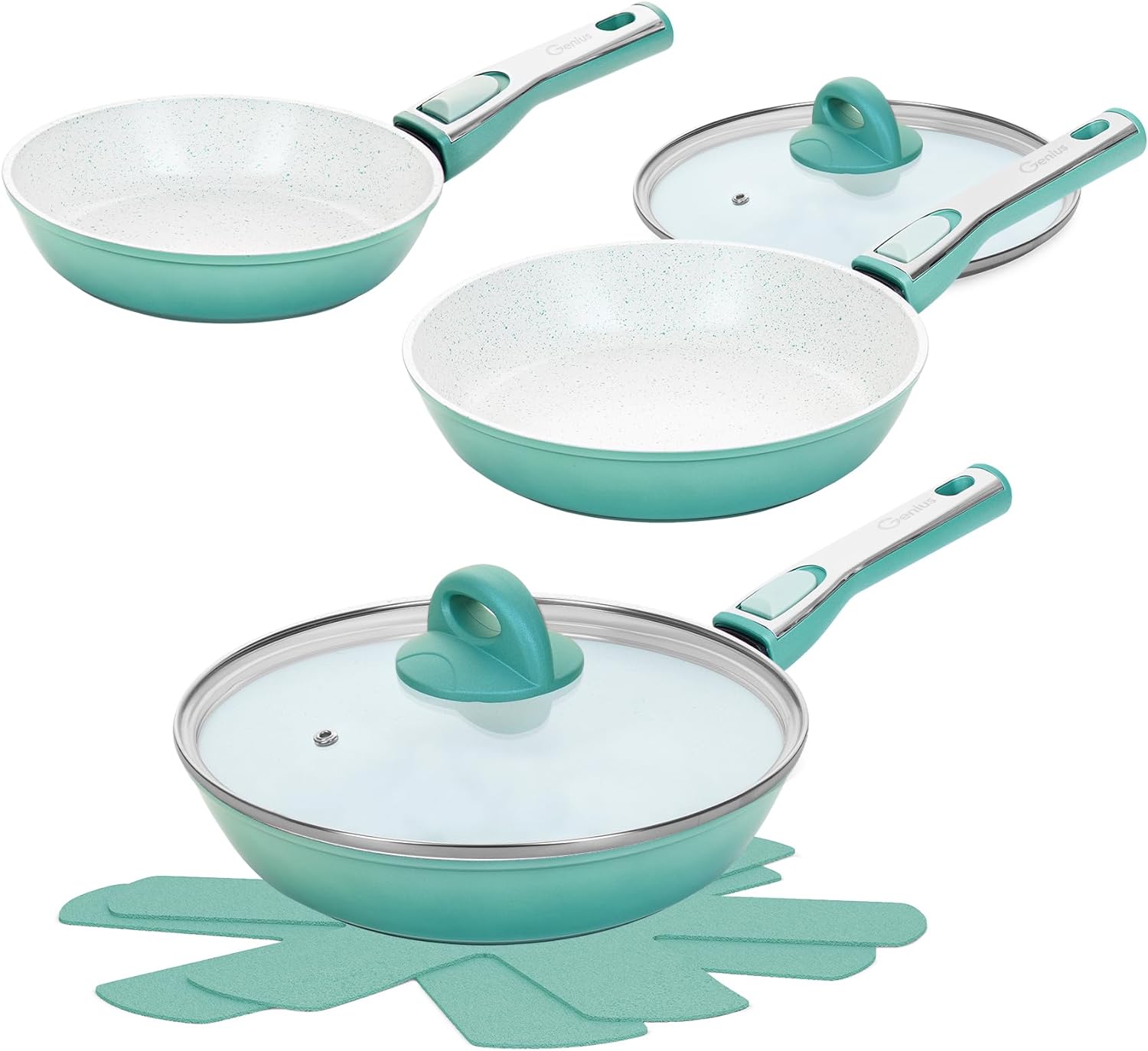 Cerafit Revolution Pfannen Set 7-tlg. 20+24+28 CM, 2 Glasdeckel, Viles Einleger, Keramik antihaftbeschichtete Bratpfanne, abnehmbarer Griff, alle Herdarten Induktion Backofen Spülmaschinen geeignet | قیمت یورویی 109.95€