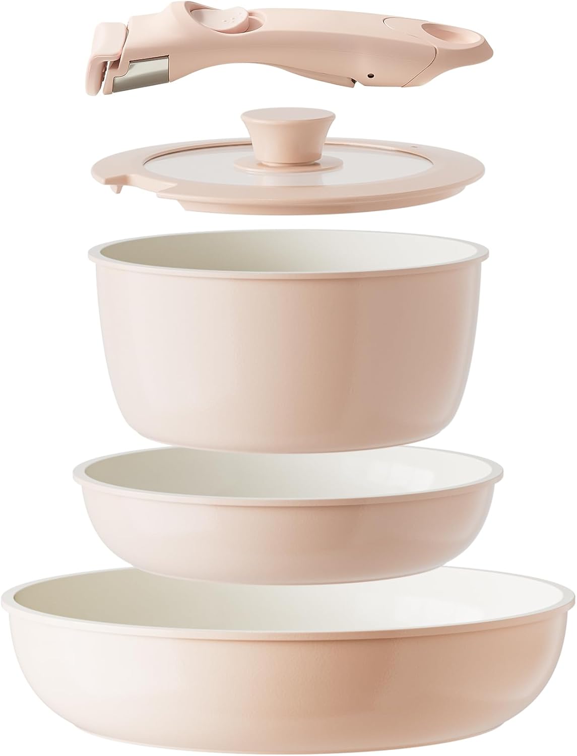 ست تابه سرامیکی Redchef با دسته قابل جابجایی، ست وسایل آشپزی RV برای کمپینگ، قابلمه سرامیکی غیر سمی، بدون PTFE، بدون PFAS، بدون PFOA، صرفه جویی در فضا، قابل شستشو در ماشین ظرفشویی، صورتی