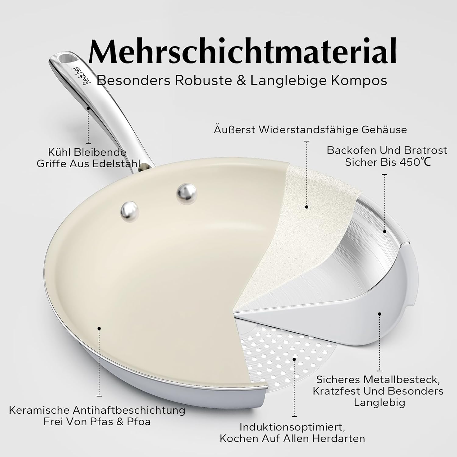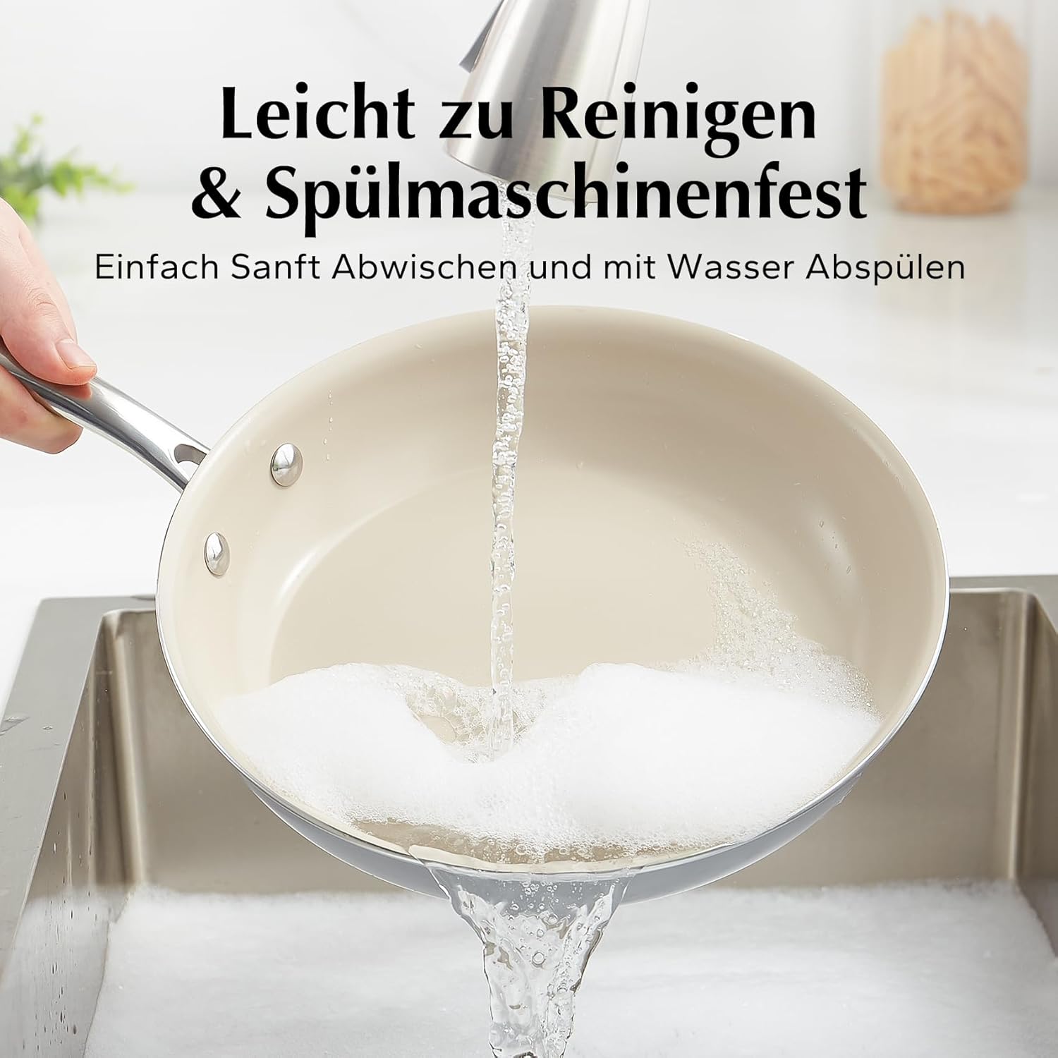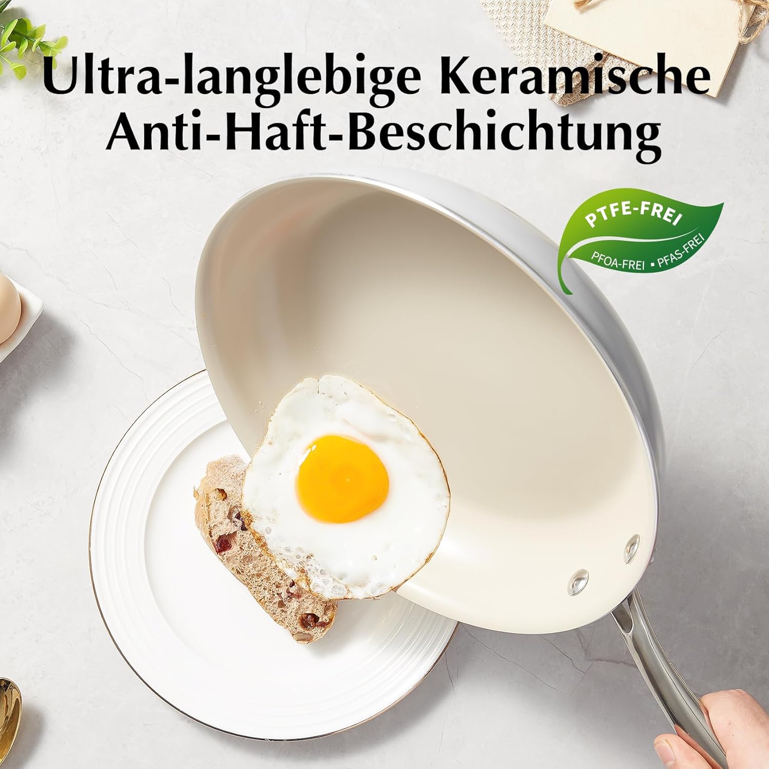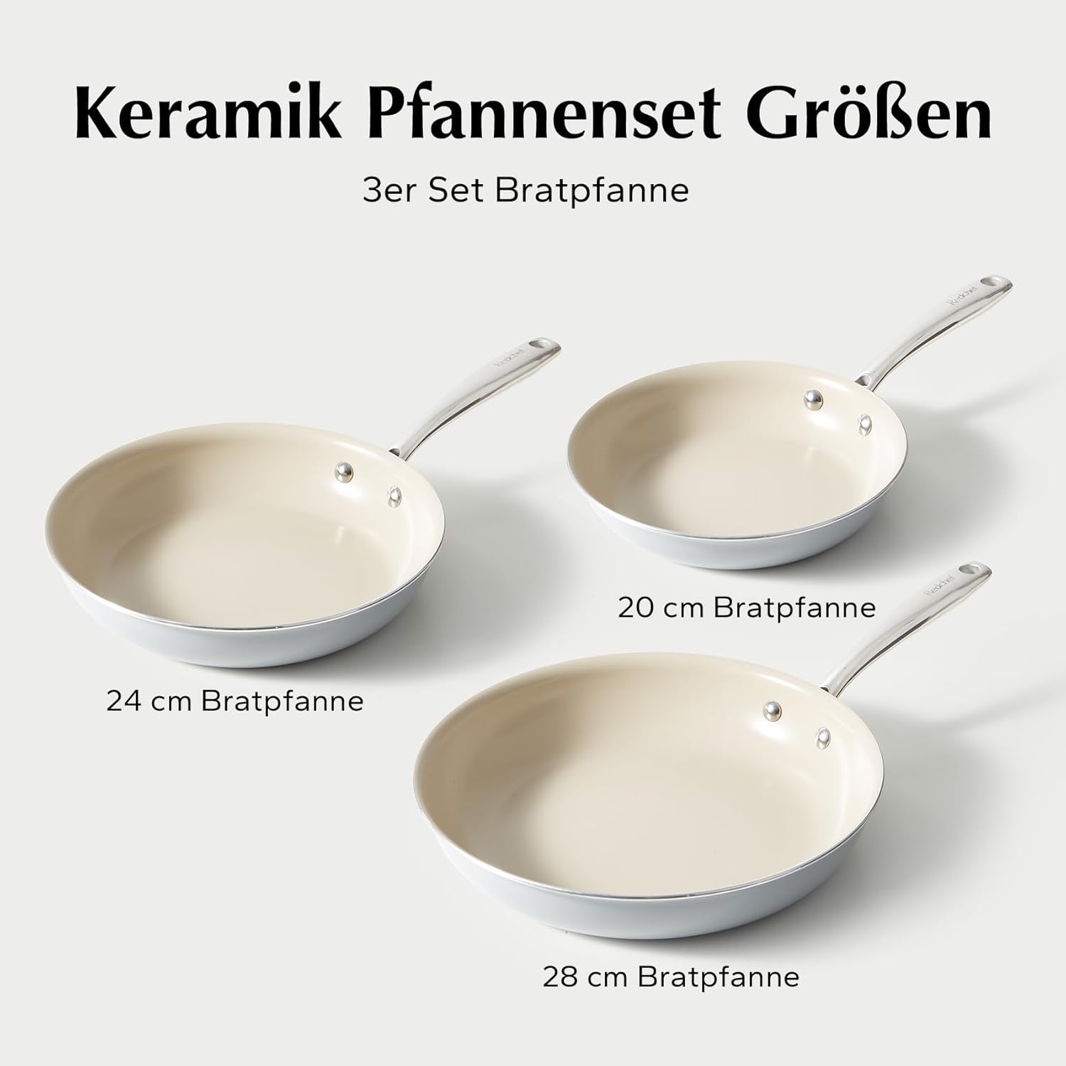 Gesundheitsbewusst: Keramikbeschichtung ist eine gesunde Wahl, die frei von PFOA; PTFE und anderen schädlichen Chemikalien ist. Sie können ohne oder mit sehr wenig Öl kochen, was Ihnen hilft, Ihre Ernährung zu kontrollieren SMART & EFFIZIENT: Das konzentrische Ringdesign am Boden der Pfanne hilft dabei, die Flüssigkeit in der Mitte zu sammeln, wenn sie erhitzt wird. Das bedeutet, dass Sie weniger Öl verwenden und schnell und gesünd kochen können Leicht zu reinigen: Die glatte Oberfläche der Keramikbeschichtung verhindert, dass Essen anhaftet, wodurch die Reinigung der Pfanne schnell und einfach wird Haltbarkeit: Keramikbeschichtungen sind sehr haltbar und kratzfest, wodurch sie eine lange Lebensdauer haben. Im Vergleich zu anderen Antihaftbeschichtungen halten sie viel länger und können daher ein gutes Preis-Leistungs-Verhältnis bieten Gleichmäßige Hitzeverteilung: Keramische Antihaft-Pfannen haben in der Regel eine gute Wärmeleitfähigkeit und Wärmeverteilung, d. h. sie erhitzen sich schnell und verteilen die Wärme gleichmäßig über die gesamte Oberfläche der Pfanne. Das führt zu guten Kochergebnissen Vielseitigkeit: Keramische Antihaftpfannen können auf allen Herdarten verwendet werden, einschließlich Induktion. Viele Modelle sind auch ofenfest, was die Flexibilität bei der Zubereitung von Speisen erhöht | قیمت یورویی : 69.99€