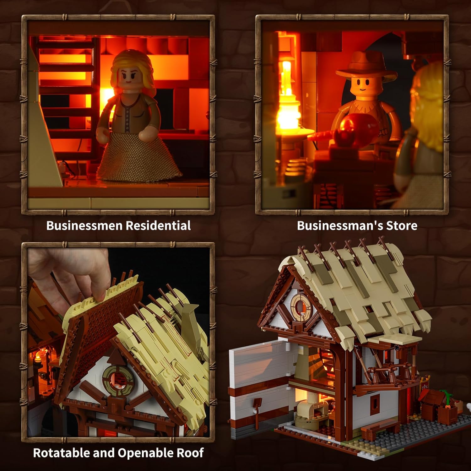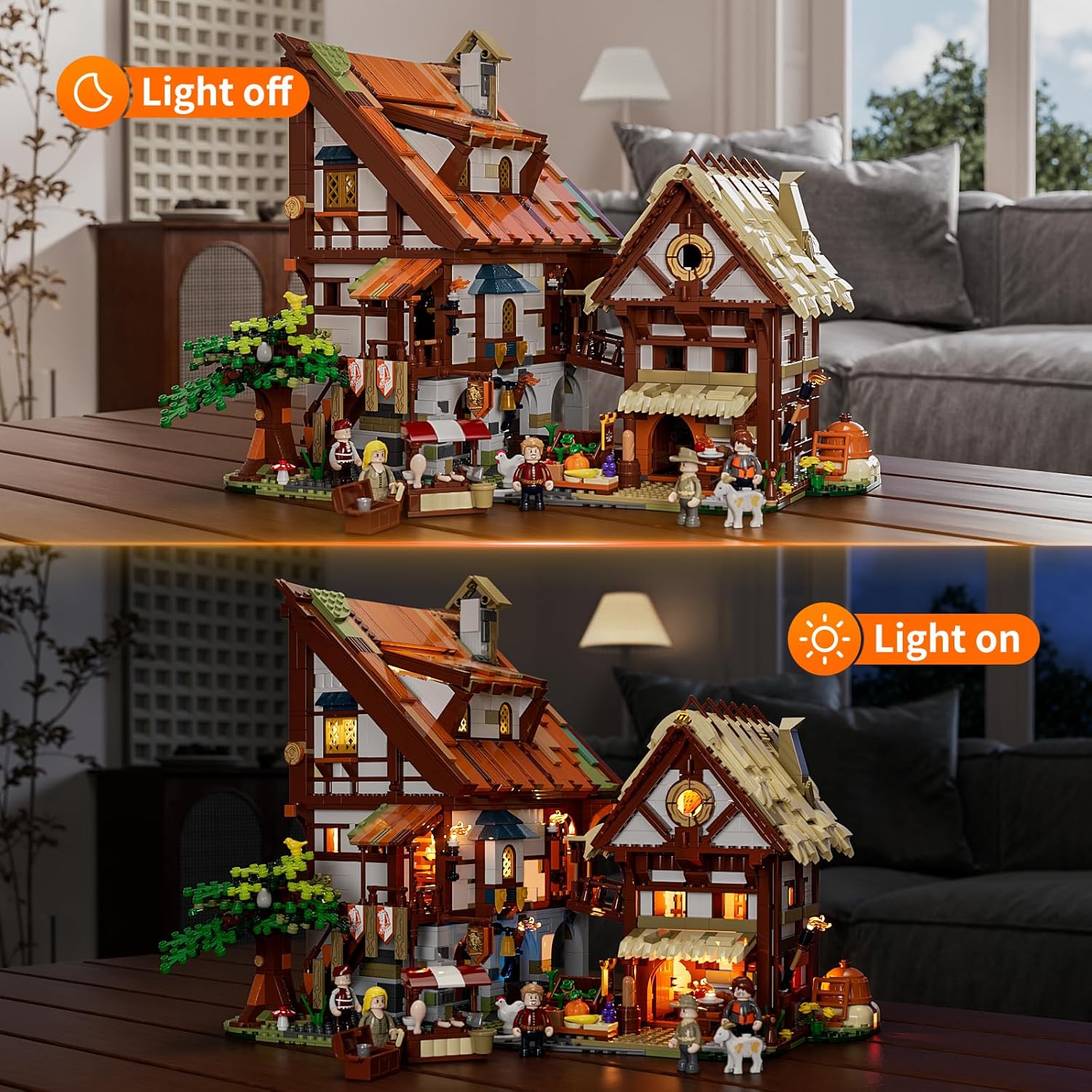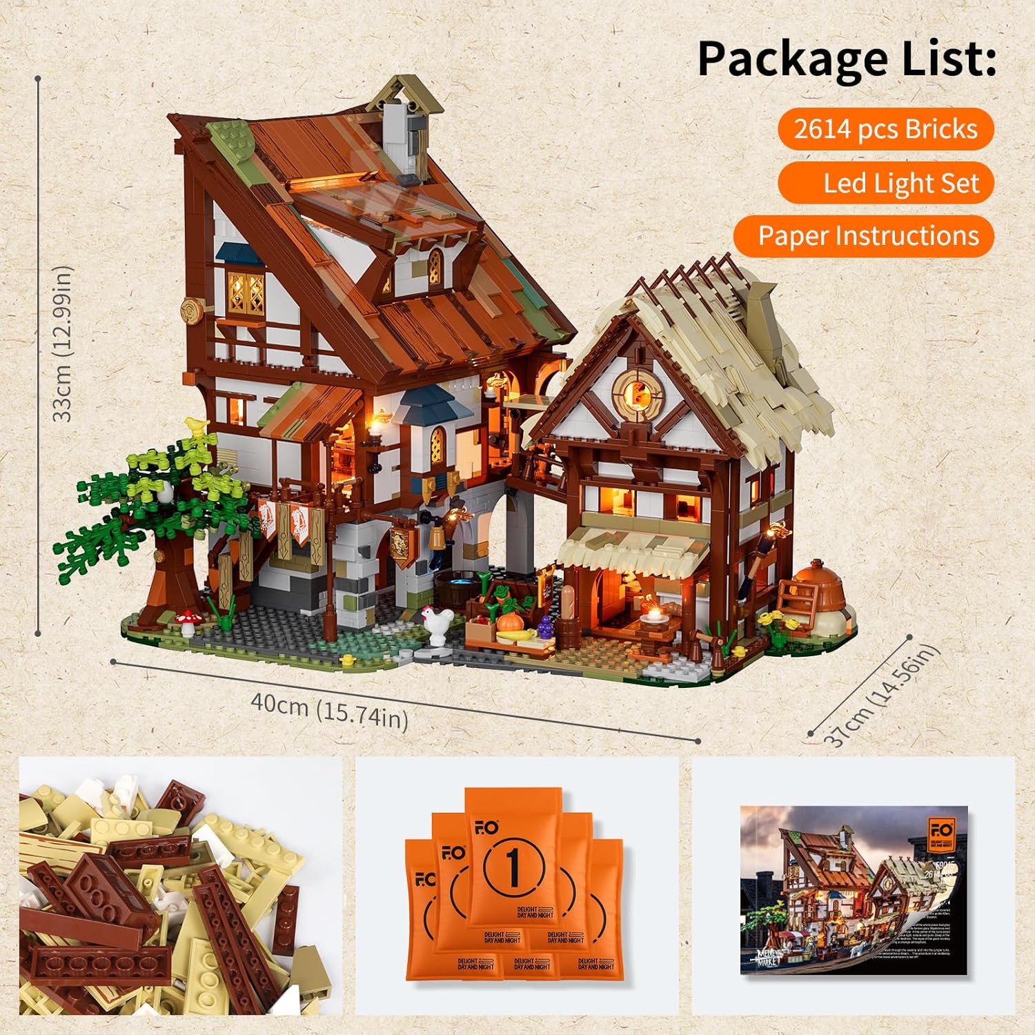 FUNWHOLE Mittelalter Markt Bauset mit LED - 2614 Stück Klemmbausteine für Erwachsene, Sammlerstück & Dekoration für Wohnzimmer, Schreibtisch oder als Geschenk | قیمت یورویی 149.99€