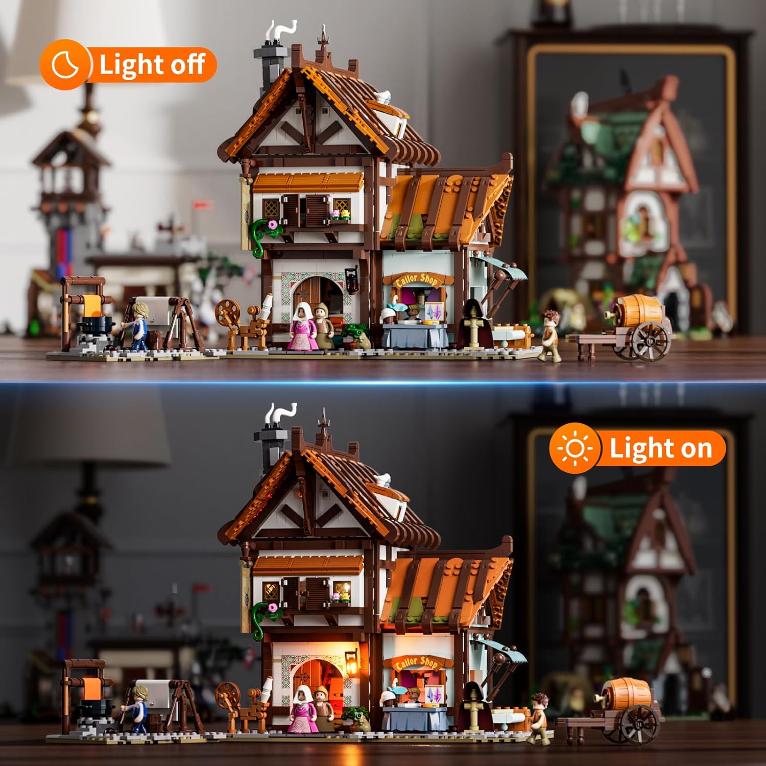 "Mittelalterliche Schneiderwerkstatt: Erleben Sie die geschäftige Altstadt Das neueste Mitglied der FUNWHOLE Mittelalter-Serie stellt die ikonischste Schneiderwerkstatt der Stadt nach. Detailliertes Design und Lichteffekte erwecken jede Szene zum Leben. Das Set umfasst einen Außenarbeitsbereich im Erdgeschoss, ein Verkaufsfenster für Fertigwaren, einen Maßschneiderbereich im zweiten Stock und einen Dachboden als Lagerraum. Fünf Mini-Figuren bereichern Ihre Geschichte—ein Schneidermeister, seine Tochter, eine Adlige mit ihrer Magd und ein junger Mann aus der Mühle. Genießen Sie ein perfektes Bauerlebnis, das Ihre mittelalterliche Geschichte zum Leben erweckt." "Mehrstufige Spielbarkeit: Entdecken Sie unendliche Möglichkeiten Dieses Bauset geht über das einfache Bauen und Ausstellen hinaus; Sie können zwei Etagen und Dächer zerlegen und wieder zusammenbauen, drei große Wände drehen und sogar die Position des Außenarbeitsbereichs anpassen. Unser sorgfältig entworfenes Set bietet vielseitiges Spiel, das Ihre Baufreude steigert, perfekt zur Entspannung und für die Interaktion in der Familie." "Stickerfreies Design: Hochwertige bedruckte Teile Keine Sticker hier! Das Set enthält 38 fein bedruckte Komponenten, darunter Taschentücher, Geldbörsen, Gürtel, Hüte usw. Alle Teile bestehen aus langlebigen Materialien, die gegen Feuchtigkeit oder Wasserschäden beständig sind. Diese exquisiten bedruckten Teile verbessern nicht nur den visuellen Effekt, sondern verleihen Ihrem Bauerlebnis auch Realismus und Haltbarkeit." "Exklusives Beleuchtungsdesign: Erhellen Sie Ihre mittelalterliche Nacht Das Set enthält 9 LED-Lichtquellen, darunter Öllampen, Fackeln und Zusatzlichter, die eine warme Beleuchtung erzeugen. Ob tagsüber ausgestellt oder nachts beleuchtet, die Schneiderwerkstatt erstrahlt in einzigartigem Glanz und verleiht Ihrer Heimdekoration eine warme und historische Note." "Kompatibel mit anderen mittelalterlichen Sets: Bauen Sie Ihre mittelalterliche Stadt Unser Bauset ist mit allen gängigen Bausteinen auf dem Markt kompatibel. Sie können es mit anderen mittelalterlichen Sets kombinieren, um eine lebendige Stadtszene zu schaffen. Ob Sammler oder Baustein-Enthusiast, die FUNWHOLE Mittelalter-Serie bietet unendlichen kreativen Raum, um Ihre mittelalterliche Traumwelt greifbar zu machen." | قیمت یورویی : 119.99€