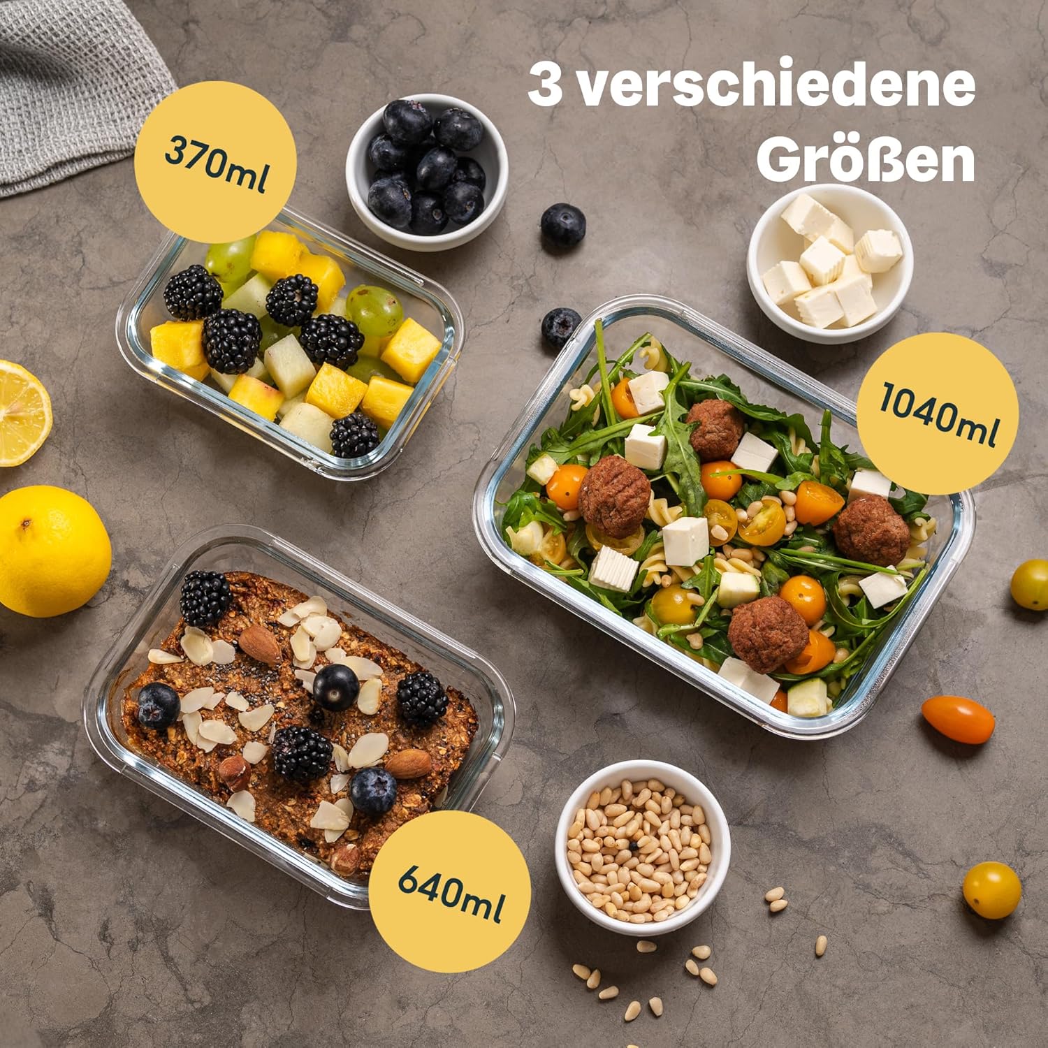 ✔ Robustes Glas - Dank des hitzebeständigen Borosilikatglases sind die Behälter für den Einsatz im Ofen, Mikrowelle oder Gefrierschrank geeignet (ohne Edelstahldeckel). Behälter bleiben geschmacks- und geruchsneutral und verfärben sich nicht, wie Plastikdosen. ✔ Der Deckel mit Edelstahl Anteil ist lebensmittelecht und dank robusten Klemmen ist die Dose wasserdicht und luftdicht. Das unterstützt einen sicheren Transport deines Essens, auch im flüssigen Zustand. ✔ Luftdicht – Tragen und lagern Sie Ihre Lebensmittel ohne Angst dank der Silikondichtung und der vier luftdichten Verschlüsse. ✔ Platzsparend & Vielseitig - Die Lebensmittelbehälter aus Glas (370 ml, 640 ml, 1040 ml) können übereinander gestapelt werden, um Stauraum zu sparen und dienen unterschiedlichen Lebensmitteln. ✔ Einfach zu reinigen - Der Glasbehälter und der Deckel aus Edelstahl sind spülmaschinenfest. So muss man sich keine Sorgen machen. | قیمت یورویی : 39.95€