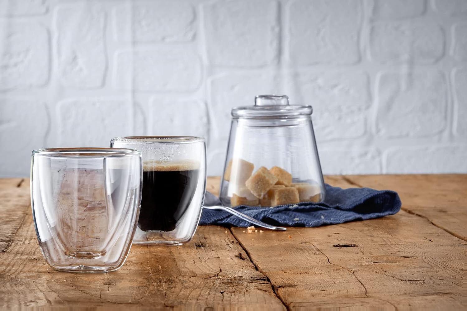 Inhalt: 2x wärmeisolierende Espressogläser doppelwandig (Höhe 6,5 cm, Füllmenge 80 ml, Ø 5,5 cm) - Artikelnummer: 0901382000 Material: Borosilikatglas doppelwandig - extrem kälte-& hitzebeständig, kratzfest und spülmaschinengeeignet. Borosilikatglas ist trotz seines leichten Gewichts äußerst stabil und robust Doppelwandige Ausführung mit Thermoeffekt: die Thermogläser doppelwandig sind nach außen isoliert und halten den Inhalt länger warm oder kalt (Espresso, Schnaps, Liköre, Vorspeisen, Desserts, Eis) Isolier-Effekt: kein Verbrennen der Finger, denn das Espressoglas doppelwandig wird durch das Vakkum von außen nur warm. Durch den Abstand der Wandung sieht es so aus, als würde das Getränk schweben Die Espressogläser doppelwandig sind ein schönes Geschenk für Männer und Frauen die gerne Kaffee trinken - ob als Geburtstagsgeschenk, zu Weihnachten als Weihnachtsgeschenk oder als Wichtelgeschenk | قیمت یورویی : 12.99€