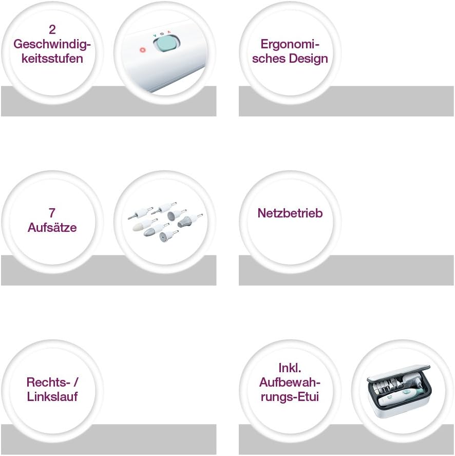 Professionelles Nagelpflegeset mit 7 hochwertigen Aufsätzen aus Saphir und und Filz: zum Kürzen, Feilen, Formen und Polieren der Nägel und zur Entfernung von Hornhaut und Nagelhaut Zur Anwendung bei speziellen Bedürfnissen bei der Nagelpflege, z.B. bei Hühneraugen, eingewachsenen Nägeln oder besonders dicker Hornhaut oder großen Schwielen Durch das ergonomische Design wird das Abrutschen während der Behandlung verhindert, zudem liegt das Gerät sehr gut in der Hand und ist vielseitig einsetzbar Leistungsstarkes Maniküre-/Pediküre Set mit einer maximalen Drehzahl von 4.600 U/min und zwei Geschwindigkeitsstufen Mit Aufbewahrungstasche, in welchem das gesamte Zubehör verstaut werden und so auch mit auf Reisen genommen werden kann | قیمت یورویی : 34.99€