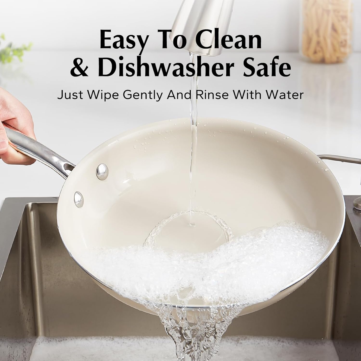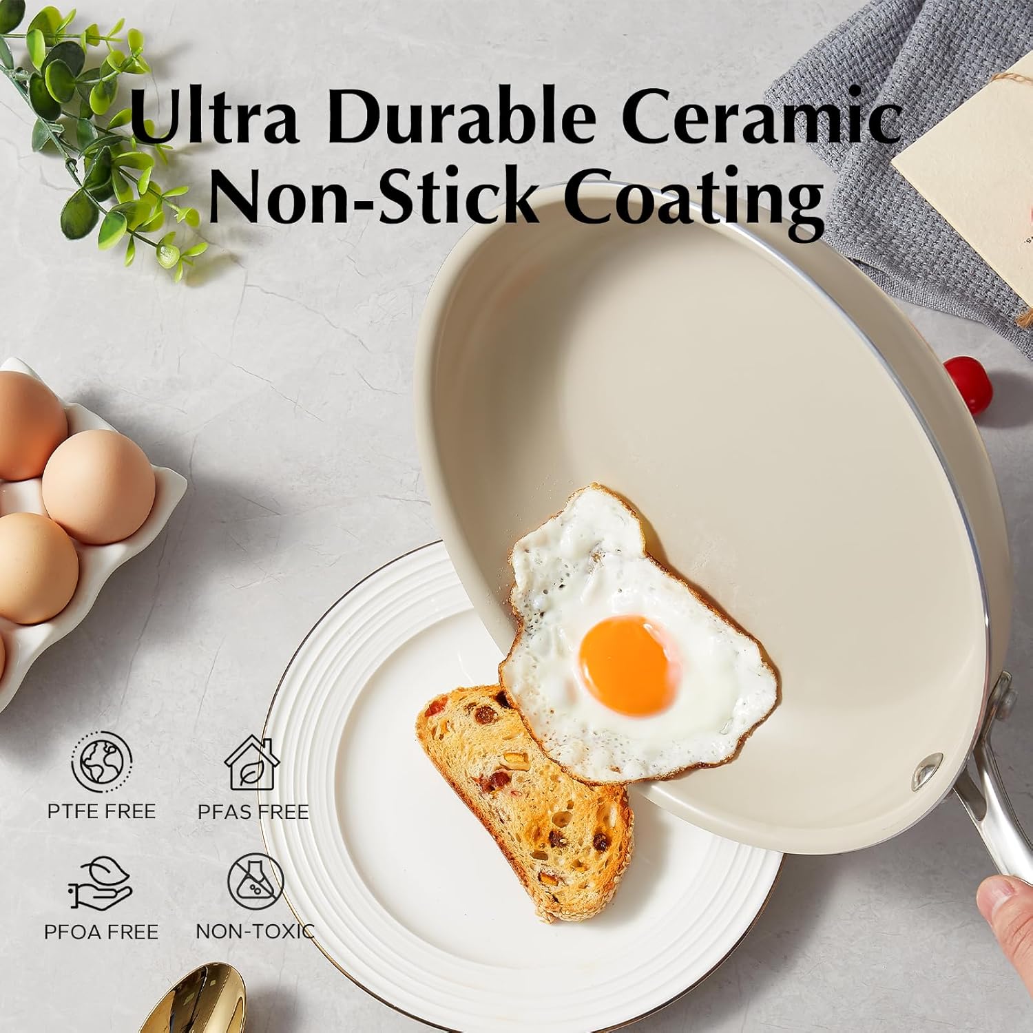 Keramik-Antihaftbeschichtung: Unsere innovative Kochfläche durchläuft einen dreilagigen Keramik-Beschichtungsprozess, langlebig und absolut sicher. Die antihaftbeschichteten Bratpfannen bieten hervorragende Antihaft-Leistung, sodass Sie Ihre Lieblingsgerichte mit minimalem Öl- oder Butterverbrauch zubereiten können Schnelle und gleichmäßige Wärmeverteilung: Unsere geschmiedete Aluminium-Antihaft-Pfanne sorgt für eine gleichmäßige Wärmeverteilung und eliminiert heiße Stellen, die Ihr Kochen stören können. Dieses professionelle Design verteilt die Metalldicke gleichmäßig über die gesamte Antihaft-Kochpfanne und erleichtert so ein schnelles und gleichmäßiges Kochen Ihrer Gerichte Cooler und stabiler Griff: Hergestellt aus leichtem, präzisionsgepresstem Edelstahl, sorgt dieser ergonomisch geformte Griff für einen komfortablen Griff. Doppelt genietet für außergewöhnliche Stärke und Beweglichkeit. Die Keramikpfanne ermöglicht es Ihnen, nahtlos vom Herd in den Ofen zu wechseln, sodass Sie makelloses Anbraten, braune Beläge oder sogar Backen erzielen können LANGLEBIG & LEICHT ZU REINIGEN - Nachdem Ihr kulinarisches Meisterwerk abgeschlossen ist, reicht ein sanftes Abwischen mit Wasser aus. Für zusätzlichen Komfort können Sie sich auch für eine schnelle und einfache Reinigung der Kochpfannen entscheiden. (Denken Sie daran, dass Handwäsche eine empfohlene Option ist, wenn Sie die Lebensdauer der Beschichtung der Pfanne verlängern möchten.) Hervorragende Kompatibilität: Vielseitigkeit vom Feinsten, unser Küchen-Kochgeschirr, die Keramik-Antihaft-Pfanne ist so konzipiert, dass sie in jeder Küche und auf jedem Herd gedeiht. Egal, ob Sie auf Induktions-, Gas- oder Elektroherden kochen, diese Keramikpfanne funktioniert mit Exzellenz. Außerdem ist sie ofenfest, mit dem Griff und der Antihaftbeschichtung können Temperaturen von bis zu 450 °C standhalten und die Fähigkeiten traditioneller Kochgeschirr übertreffen IDEAL FÜR ALLE ARTEN VON KOCHEN - Unsere antihaftbeschichteten Pfannen sind der makellose Begleiter für Familienessen und praktisch jeden Kochanlass. Egal, ob Sie Eier mit der sonnigen Seite herstellen, ein Gemüsesorte sautieren, Eier braten, Pfannkuchen und Omeletts wenden oder saftige Steaks anbraten und köstliche Burger grillen, antihaftbeschichtete Kochgeschirrpfanne bewältigt mühelos alle Ihre kulinarischen Abenteuer mit Leichtigkeit und Präzision | قیمت یورویی : 128.84€