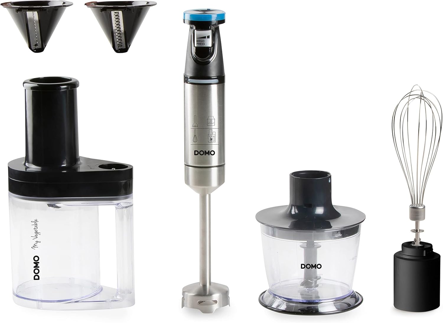 DOMO Stabmixer Set 4-in-1 - Ergo Press - Inklusive 4 Aufsätze: Mixstab, Schneebesen, Zerkleinerer, Spiralschneider - 800W | قیمت یورویی 59.49€