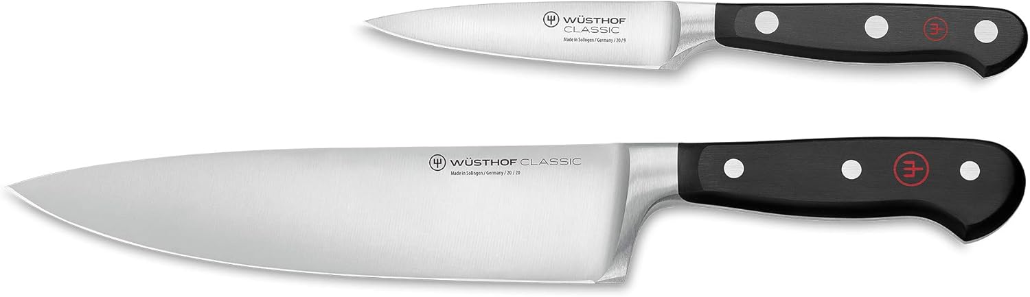 WÜSTHOF Classic Messersatz mit 2 Messern, Schwarz,silber لینک آمازون : https://www.amazon.de/dp/B085V64MVB?th=1&psc=1 چاقوهای کلاسیک ووستوف با طراحی بینظیر و کیفیت بالای خود، همه را شگفتزده میکنند. مراقبت از آنها آسان است و ابزار آشپزی ایدهآلی را برای هر طرفدار غذا ارائه میدهند - برای مثال، این مجموعه چاقوی سرآشپز حرفهای شامل ۱ چاقوی سرآشپز ژاپنی و ۱ چاقوی کوچک برای سبزیجات است. چاقوی سرآشپز (طول تیغه 20 سانتیمتر): این چاقوی تیز و همهکاره با تیغه پهن و قدرت برش بالا، برای وزن کردن، خرد کردن، بریدن، شکل دادن، فشار دادن و حمل انواع مواد غذایی ایدهآل است - مهمترین چاقو برای سرآشپزها چاقوی سبزیجات (9 سانتیمتر): این چاقوی کوچک و همهکاره با تیغه کوتاه، پیاز و سبزیجات را به همان اندازه که میتوانید برای خرد کردن، تمیز کردن و تزئین سبزیجات (همچنین به عنوان چاقوی میوهخوری) استفاده کنید، برش میدهد - یک چاقوی همهکاره، بسیار تیز و همهکاره تیغههای فوقالعاده تیز از یک تکه فولاد ووستوف ساخته شدهاند، تا ۵۸ درجه راکول سخت شدهاند و قبل از پرداخت نهایی با دست، با استفاده از یک فرآیند تیز کردن مبتنی بر لیزر، سنگزنی شدهاند - و بدین ترتیب تیزی فوقالعاده و ماندگار آنها تضمین میشود. چاقوهای آشپزخانه تیز با دستههای ارگونومیک، بسیار بهداشتی و با تعادل بهینه - ایدهآل برای سرآشپزهای حرفهای و آماتور برای برش ایمن. چاقوهای برند از یک شرکت واقعاً سنتی: ووستوف - ساخت آلمان، آهنگری شده در زولینگن