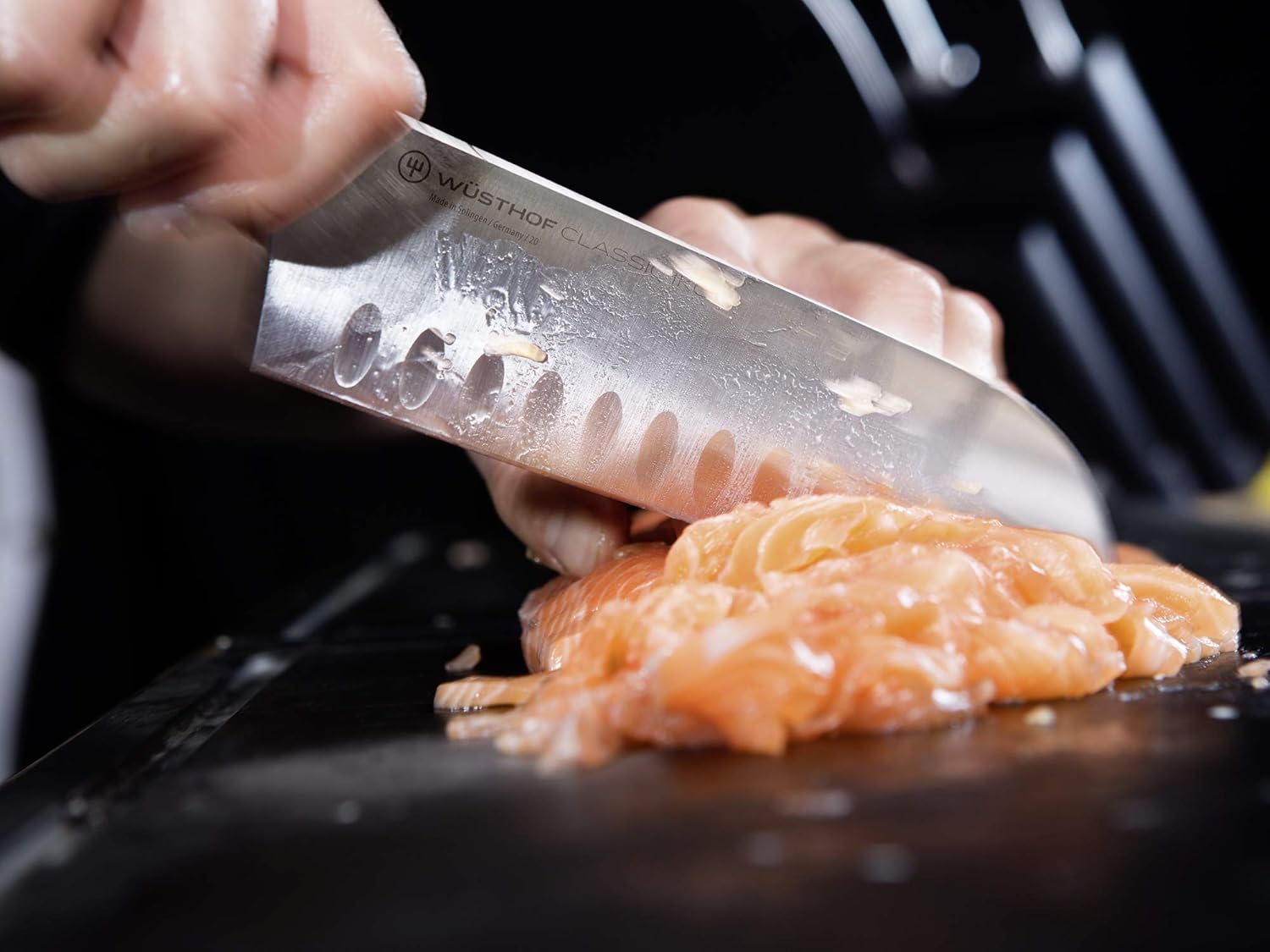 Als elegante Profimesser aus Solingen beeindrucken die Wüsthof Messer der Classic Ikon Serie selbst anspruchsvolle Perfektionisten. So ist auch dieses Kochmesser Set mit 2 scharfen Messern ein kompromisslos gutes Profi Messerset mit zeitlosem Design Das Messer Set enthält 2 elegante Profi Kochmesser: 1 Santokumesser mit 17cm Klinge und Kullenschliff (japanisches Kochmesser für Fleisch, Fisch und Gemüse) sowie 1 kleines Universalmesser für Gemüse als kurzes Allzweckmesser mit gerader 8cm Klinge Die langlebigen Solinger Klingen der Küchen Messer erhalten in Handarbeit ihren finalen Polierabzug, also ihre ultrascharfen Klingen. Die beidseitige Gewichtung des Griffes (Doppel-Kropf) sorgt für präzises Handling – auch bei schnellen Schnitttechniken Ergonomische Griffe – durch die kleine Wölbung im vorderen Bereich liegen die rutschfesten Griffschalen besonders sicher in der Hand. Die pflegeleichten Griffe sind mit Edelstahl-Nieten fugenlos vernietet und sehen in jeder Küche sehr gut aus Als ideal ausbalanciertes Kochmesser beeindruckt Wüsthof Classic Ikon jeden Profi-Koch und ist dank der scharfen Messerklinge das offizielle Kochwerkzeug der deutschen Nationalmannschaft der Köche. Premiummesser – Made in Germany, geschmiedet in Solingen | قیمت یورویی : 185.99€