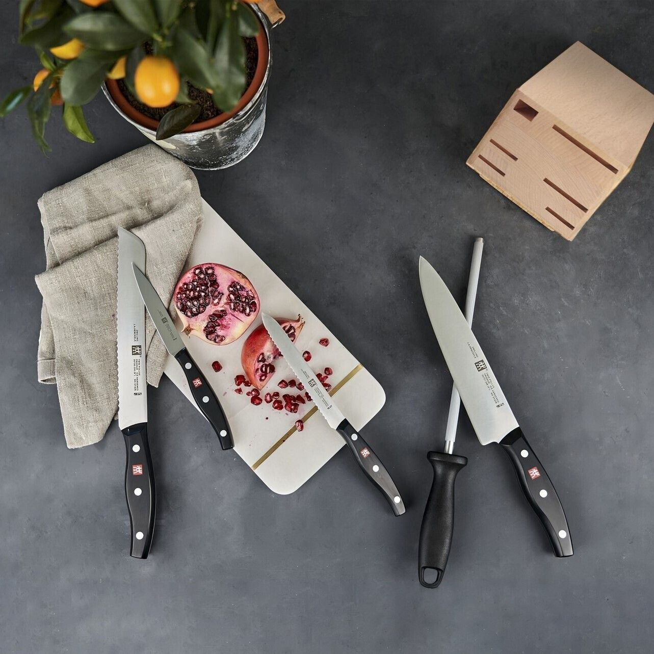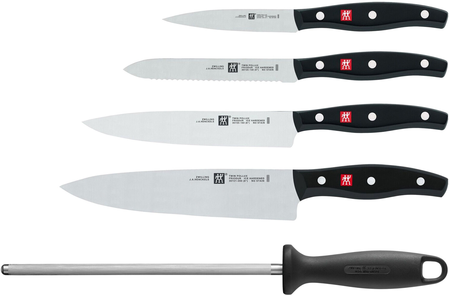 ست چاقوی zwilling سری Twin Pollux شامل 6 پارچه چاقوی آشپزخانه همراه با بلوک چوبی طبیعی (بامبو) است. این ست با تیغههای فولاد ضد زنگ سختکاری شده FRIODUR® و طراحی ارگونومیک، انتخابی مناسب برای آشپزی خانگی و حرفهای محسوب میشود.