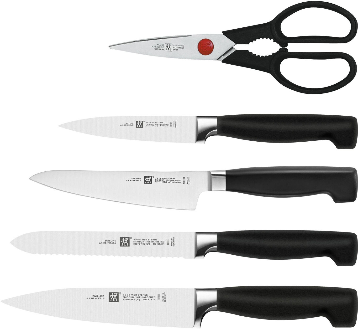 ست چاقوی zwilling سری Vier Sterne شامل 6 پارچه چاقوی ضروری آشپزخانه همراه با بلوک چوبی سفیدرنگ است. این ست با تیغههای فولاد ضد زنگ سختکاری شده FRIODUR® و دستههای ارگونومیک سفیدرنگ، انتخابی مناسب برای آشپزی خانگی و حرفهای است.