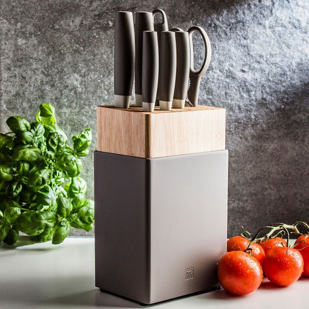 ست چاقوی zwilling سری Now S یکی از بهترین گزینهها برای آشپزهای حرفهای و خانگی است. این مجموعه شامل 8 پارچه چاقوی ضروری آشپزخانه بوده که در یک بلوک چوبی مقاوم به رنگ خاکستری (طوسی) قرار گرفتهاند.