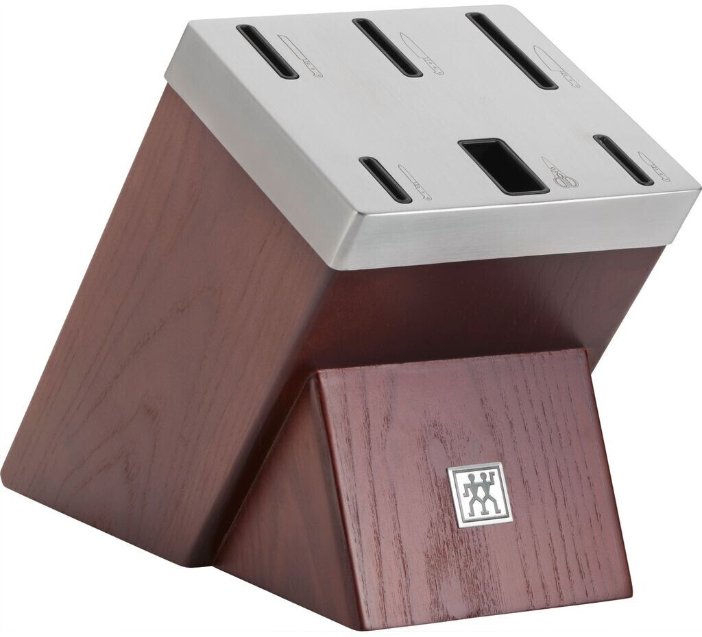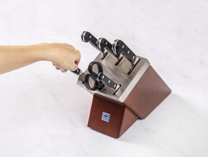 ست چاقوی zwilling سری Pro شامل 7 پارچه چاقوی حرفهای آشپزخانه همراه با بلوک چوبی مجهز به سیستم تیزکن خودکار Self-Sharpening SharpBlock، مناسب برای برش دقیق و طول عمر بالا.