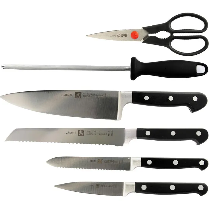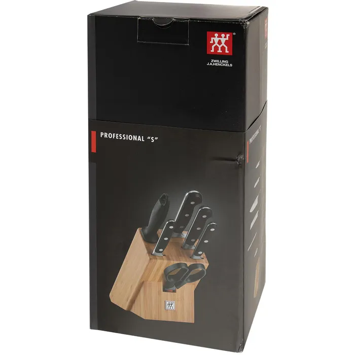 ست چاقوی zwilling سری Professional S شامل 7 پارچه چاقوی حرفهای آشپزخانه همراه با بلوک چوبی از جنس بامبو و قیچی چندمنظوره، ساختهشده از فولاد ضد زنگ سختکاری شده FRIODUR® با طراحی ارگونومیک و مقاوم.
